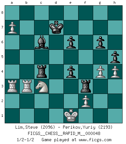 Last move : 1/2-1/2 2012 February 7 13:16:23 [Event "FICGS__CHESS__RAPID_M__000048"] [Site "FICGS"] [Date "2011.10.02"] [Round "1"] [White "Lim,Steve"] [Black "Perikov,Yuriy"] [Result "1/2-1/2"] [WhiteElo "2096"] [BlackElo "2193"] 1.d4 Nf6 2.c4 e6 3.Nf3 d5 4.g3 dxc4 5.Bg2 Nc6 6.Qa4 Bb4+ 7.Bd2 Nd5 8.Bxb4 Ndxb4 9.Nc3 Bd7 10.O-O a5 11.Qd1 O-O 12.e3 a4 13.Qe2 Na5 14.Ne5 a3 15.Nxc4 axb2 16.Qxb2 Nd3 17.Qb1 Nxc4 18.Qxd3 Nd6 19.Rfb1 Ra3 20.Rb3 Ra5 21.Bxb7 c5 22.dxc5 Nxb7 23.Rxb7 Bc6 24.Qxd8 Rxd8 25.Rb3 Kf8 26.a4 Rd3 27.e4 h6 28.Kf1 Rxc5 29.R1a3 f5 30.a5 Ke8 31.a6 fxe4 32.a7 Kd7 33.h4 g6 34.g4 Rf3 35.Ke2 Rc4 36.Ke1 h5 1/2-1/2 Queen's pawn game Kingside Castling by player White (move 10) Kingside Castling by player Black (move 11) This chess game ended in a draw. Follow this game move after move (download)Strategy requires thought, tactics require observation. (Max Euwe) Glücklicherweise sind Großmeister Ruben Fines reine Schachbücher weniger phallozentrisch [als seine Schachpsychologie] und deswegen auch weniger lächerlich. (Nigel Short) ¿Que sería del Ajedrez sin errores graciosos?. (Kurt Richter) Le profane ne songe pas à la somme de jouissance dont il se prive, qui méconnaît ce jeu aux ressources aussi variées que passionnantes. (Jean-Marie Jeanton-Lamarche) Luck is the residue of design. (John Milton)
