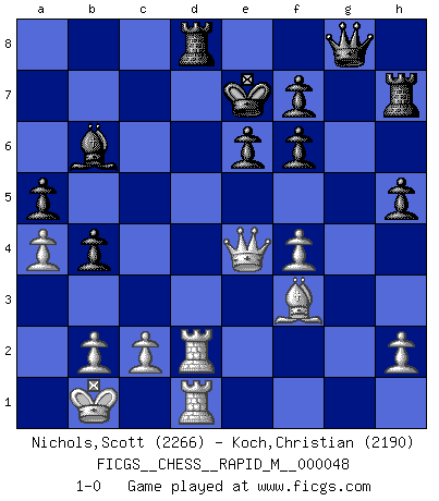 Last move : 1-0 2011 October 26 21:56:53 [Event "FICGS__CHESS__RAPID_M__000048"] [Site "FICGS"] [Date "2011.10.02"] [Round "1"] [White "Nichols,Scott"] [Black "Koch,Christian"] [Result "1-0"] [WhiteElo "2266"] [BlackElo "2190"] 1.e4 c5 2.Nf3 d6 3.d4 cxd4 4.Nxd4 Nf6 5.Nc3 Nc6 6.Bg5 e6 7.Qd2 a6 8.O-O-O Bd7 9.f4 h6 10.Bh4 b5 11.Bxf6 gxf6 12.Kb1 Qb6 13.Nce2 Rc8 14.Qd3 h5 15.Nxc6 Bxc6 16.Nd4 Bb7 17.Be2 b4 18.Bf3 Be7 19.Qb3 Kf8 20.Rd2 Qc7 21.Rhd1 Qc4 22.Qe3 Qc5 23.Qe2 Qc4 24.Rd3 a5 25.Qd2 Qc5 26.a4 Ba6 27.Re3 Rh7 28.Be2 Bb7 29.Bb5 d5 30.exd5 Qxd5 31.Qc1 Qxg2 32.Re2 Qg8 33.Qe3 Bc5 34.Qd3 Bd5 35.Bd7 Rb8 36.Bc6 Rd8 37.Bxd5 Bxd4 38.Bf3 Ke7 39.Red2 Bb6 40.Qe4 1-0 Sicilian : Richter-Rauzer, Rauzer attack, 7...a6 Queenside Castling by player White (move 8) Player White won this chess game. Follow this game move after move (download)Checkers is for tramps. (Paul Morphy) Man wirke der falschen Auffassung entgegen, als ob jeder Zug Unmittelbares zu leisten habe; auch Werte- und Ruhezüge haben ihre Existenzberechtigung. (Aaron Nimzowitsch) El Ajedrez es sobre todo, ¡una pelea!. (Emanuel Lasker) L'ordinateur a tué l'originalité. Il n'y a plus guère d'aventures sur l'échiquier. (Jacob Murray) In every real man a child is hidden that wants to play. (Friedrich Nietzsche)