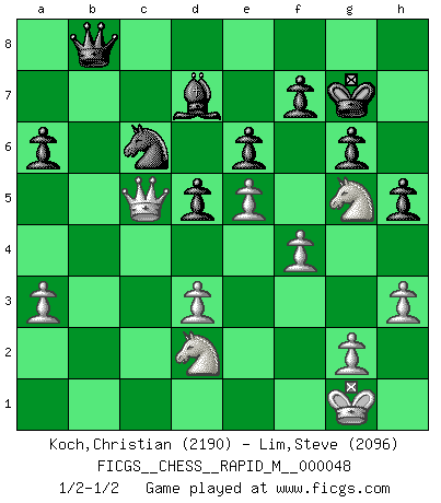Last move : 1/2-1/2 2012 January 20 20:17:25 [Event "FICGS__CHESS__RAPID_M__000048"] [Site "FICGS"] [Date "2011.10.02"] [Round "1"] [White "Koch,Christian"] [Black "Lim,Steve"] [Result "1/2-1/2"] [WhiteElo "2190"] [BlackElo "2096"] 1.e4 e6 2.d4 d5 3.Nc3 Nf6 4.e5 Nfd7 5.f4 c5 6.Nf3 Nc6 7.Be3 a6 8.Qd2 b5 9.a3 Qb6 10.Ne2 Qc7 11.Ng3 Be7 12.dxc5 Nxc5 13.Qf2 Na4 14.Rb1 h5 15.Bd3 b4 16.O-O g6 17.Ne2 bxa3 18.bxa3 Rb8 19.Rxb8 Qxb8 20.Ned4 Qc7 21.Nb3 O-O 22.Ng5 Nb2 23.Bc5 Kg7 24.Bxe7 Qxe7 25.Qc5 Qb7 26.Rb1 Nxd3 27.cxd3 Bd7 28.Nd2 Qa8 29.h3 Rb8 30.Rxb8 Qxb8 1/2-1/2 French : Steinitz, Boleslavsky variation Kingside Castling by player White (move 16) Kingside Castling by player Black (move 21) This chess game ended in a draw. Follow this game move after move (download)You have to have the fighting spirit. You have to force moves and take chances. (Bobby Fischer) Die größte Kunst beim Schach besteht darin dem Gegner nicht zu zeigen was er tun kann. (Garry Kasparov) Nada excita más a Grandes Maestros aburridos que una novedad teórica. (Dominic Lawson) Botvinnik disait en comparant les échecs à la musique: Il existe une science dont le but est l'étude de l'acoustique et des sons. Mais il y a aussi un art qui se sert de l'océan des sons : c'est la musique. De toute évidence, il en est de même pour la pensée. La logique est l'étude des lois de la réflexion et les échecs reflètent, en tant qu'art, le côté logique de la réflexion, sous la forme d'images artistiques... Extrait de Fischer - Spassky, Reykjavik 1972 par Alexander & F. Wyndham (Ed. Solar), p 37. Some people are so afraid to die that they never begin to live. (Henry Van Dyke)
