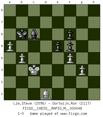 Last move : 1-0 2012 February 16 9:9:31 [Event "FICGS__CHESS__RAPID_M__000048"] [Site "FICGS"] [Date "2011.10.02"] [Round "1"] [White "Lim,Steve"] [Black "Oortwijn,Ron"] [Result "1-0"] [WhiteElo "2096"] [BlackElo "2117"] 1.d4 Nf6 2.c4 e6 3.Nf3 b6 4.g3 Ba6 5.Qa4 c6 6.Nc3 b5 7.cxb5 cxb5 8.Nxb5 Qb6 9.Nc3 Nc6 10.e4 Bb7 11.Bg2 Qb4 12.Qc2 Nxd4 13.Nxd4 Qxd4 14.O-O Rc8 15.Be3 Qe5 16.Bxa7 Bc5 17.Bxc5 Rxc5 18.Qb3 Ba8 19.Qb4 O-O 20.Nd5 d6 21.f4 Qh5 22.Nxf6+ gxf6 23.Bf3 Qh6 24.Rad1 Rfc8 25.Rxd6 Rc4 26.Rd8+ Rxd8 27.Qxc4 Rd2 28.Rf2 Rxf2 29.Kxf2 Qxh2+ 30.Bg2 Bb7 31.Qd3 h5 32.Qd1 Bxe4 33.Qg1 Qxg1+ 34.Kxg1 Bc2 35.Bf3 Kf8 36.Kf2 Ke7 37.Ke3 f5 38.Bxh5 f6 39.Kd2 Ba4 40.b3 Bc6 41.a4 Kd6 42.Kc3 Kc7 43.Bd1 e5 44.b4 Kb6 45.a5+ 1-0 Queen's Indian : Nimzovich variation (exaggerated Fianchetto) Kingside Castling by player White (move 14) Kingside Castling by player Black (move 19) Player White won this chess game. Follow this game move after move (download)Chess is everything: art, science and sport. (Anatoly Karpov) Ein Springer auf f6 gegen die eigene Rochadestellung ist schlimmer als ein rostiger Nagel im Knie. (Efim Bogoljubov) Creo que una cierta cantidad de temperamento es esperada de los genios del Ajedrez. (Ron Gross) Les échecs, c'est l'imagination. (David Bronstein) Computers are like Old Testament gods; lots of rules and no mercy. (Joseph Campbell)