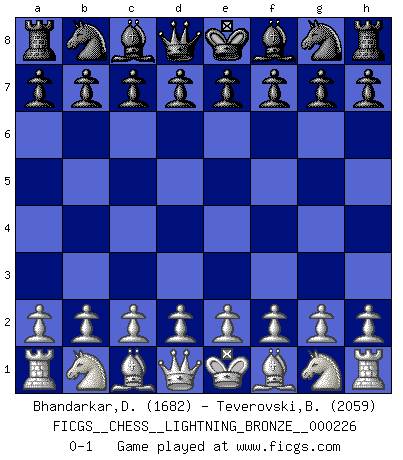 Last move : 0-1 2011 October 3 15:5:45 [Event "FICGS__CHESS__LIGHTNING_BRONZE__000226"] [Site "FICGS"] [Date "2011.10.03"] [Round "1"] [White "Bhandarkar,Dinesh"] [Black "Teverovski,Bogoljub"] [Result "0-1"] [WhiteElo "1682"] [BlackElo "2059"] 0-1 This chess game has been lost on time (started : 2011.10.03 11:24:23) Player Black won this chess game. Follow this game move after move (download)The tactician must know what to do whenever something needs doing; the strategist must know what to do when nothing needs doing. (Savielly Tartakover) Strategie ist, wie man ein Mädchen auf den Rücksitz bekommt. Taktik ist, was man tut, wenn man dann dort ist. (Anonymous) Uno no tiene que jugar muy bien, es suficiente jugar mejor que el oponente. (Siegbert Tarrasch) Je ne suis pas le dernier à jouer lâchement des coups douteux pendant le zeïtnot de l'adversaire pour l'achever: en effet les coups qui font le plus peur sont ceux que l'on ne comprend pas. Je me fais souvent peur quand je joue. (Un professeur anonyme) A shortcut is the longest distance between two points. (Don Groves)
