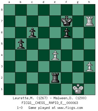 Last move : 1-0 2012 February 10 19:22:5 [Event "FICGS__CHESS__RAPID_E__000063"] [Site "FICGS"] [Date "2011.10.04"] [Round "1"] [White "Leurette,Marc-Antoine"] [Black "Malween,Denis"] [Result "1-0"] [WhiteElo "1267"] [BlackElo "1200"] 1.e4 e5 2.Nf3 Nc6 3.Bc4 Bc5 4.d3 Nf6 5.Ng5 O-O 6.O-O d6 7.Nc3 h6 8.Nf3 Bg4 9.h3 Bh5 10.Be3 Bb6 11.Bxb6 axb6 12.Bd5 Nxd5 13.Nxd5 Nd4 14.g4 Bg6 15.Nxd4 exd4 16.c3 dxc3 17.bxc3 f6 18.c4 h5 19.f4 Qd7 20.f5 Bf7 21.gxh5 Bxd5 22.cxd5 c6 23.dxc6 bxc6 24.Qg4 Kf7 25.Qg6+ Kg8 26.Kh1 d5 27.h6 Qf7 28.Rg1 Qxg6 29.fxg6 gxh6 30.g7 Rf7 31.Rg6 dxe4 32.dxe4 Ra4 33.Rg4 Rxg7 34.Rh4 Rg6 35.Rg1 Rxg1+ 36.Kxg1 Kg7 37.Rg4+ Kf7 38.Rh4 Rxa2 39.Rxh6 Re2 40.Rh4 b5 41.Rh7+ 1-0 This chess game has been lost on time (started : 2011.10.04 20:27:39) Giuoco Pianissimo Kingside Castling by player Black (move 5) Kingside Castling by player White (move 6) 10 pieces endgame at move 38 : White KRPP , Black KRPPPP WHITE : King + 1 Rook 2 Pawns BLACK : King + 1 Rook 4 Pawns 9 pieces endgame at move 39 : White KRPP , Black KRPPP WHITE : King + 1 Rook 2 Pawns BLACK : King + 1 Rook 3 Pawns Player White won this chess game. Follow this game move after move (download)What is the difference between chess and football? Everybody understands football, but nobody plays it. Everybody plays chess, but nobody understands it. Everything is relative. (Vladimir Kramnik) Capablanka war das größte Genie der Schachgeschichte! Aber denken sie nicht er habe nichts vom Schach verstanden. Er wusste nur soviel wie er wissen musste um seine Ziele zu erreichen. (Mikhail Moiseyevich Botvinik) No puedes jugar al Ajedrez si eres de corazón noble. (Proverbio Francés) Roi des jeux et jeu des rois, les échecs portent en eux un sentiment d'infini. Ils donnent à celui qui s'est efforcé d'en approfondir les arcanes l'impression de n'être pas à la mesure de l'homme; en fait, ils constituent un résumé de l'univers, un microcosme, et figurent cette grande échelle qui, dans les plans de la lumière descend jusqu'à la matière, qui des abîmes insondables remonte jusqu'en l'infini de Dieu. (Pyrame) If you work for a living, why do you kill yourself working ? (Tuco to a chicken in The Good, The Bad and The Ugly)