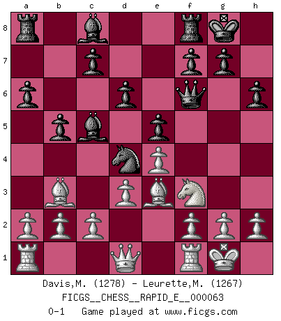 Last move : 0-1 2011 November 19 13:1:25 [Event "FICGS__CHESS__RAPID_E__000063"] [Site "FICGS"] [Date "2011.10.04"] [Round "1"] [White "Davis,Mark"] [Black "Leurette,Marc-Antoine"] [Result "0-1"] [WhiteElo "1278"] [BlackElo "1267"] 1.e4 e5 2.Nf3 Nc6 3.Bb5 Nf6 4.Nc3 Bc5 5.d3 O-O 6.O-O a6 7.Ba4 b5 8.Bb3 h6 9.Nd5 d6 10.Nxf6+ Qxf6 11.Be3 Nd4 0-1 This chess game has been lost on time (started : 2011.10.04 20:27:39) Ruy Lopez : Berlin defense Kingside Castling by player Black (move 5) Kingside Castling by player White (move 6) Player Black won this chess game. Follow this game move after move (download)The blunders are all there on the board, waiting to be made. (Savielly Tartakover) Intelligenz läßt sich nicht am Weg, sondern nur am Ergebnis feststellen. (Garry Kasparov) Cada Peón es potencialmente una Reina. (James Mason) Les pièces de l'échiquier étaient impitoyables. Elles le retenaient, elles l'absorbaient. Il y avait de l'horreur en cela, mais aussi une harmonie unique. Car, qu'y a-t-il dans le monde, à part les échecs ? (V. Nabokov) There is no instance of a country having benefited from prolonged warfare. (Sun Tzu)