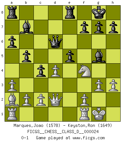 Last move : 0-1 2007 February 1 18:4:0 [Event "FICGS__CHESS__CLASS_D__000024"] [Site "FICGS"] [Date "2007.01.03"] [Round "1"] [White "Marques,Joao"] [Black "Keyston,Ron"] [Result "0-1"] [WhiteElo "1578"] [BlackElo "1649"] 1.e4 d5 2.exd5 Qxd5 3.Nc3 Qd6 4.d4 Nf6 5.Nf3 a6 6.Bc4 b5 7.Bb3 Bb7 8.Be3 e6 9.h3 Be7 10.O-O Nbd7 11.a3 c5 12.Nh2 c4 13.Ba2 O-O 14.Ng4 Bd8 15.Nxf6+ Nxf6 16.Ne2 Nd5 17.Qd2 Re8 18.Bf4 Nxf4 19.Nxf4 Bg5 20.g3 e5 0-1 Scandinavian : Pytel-Wade variation Kingside Castling by player White (move 10) Kingside Castling by player Black (move 13) Player Black won this chess game. Follow this game move after move (download)Bobby Fischer's current state of mind is indeed a tragedy. One of the world's greatest Chess players - the pride and sorrow of American Chess. (Frank Brady) Man gibt nur Pakete auf. (Paul Keres) Alekhine es un poeta que crea un trabajo de arte de algo que raramente inspiraría a otra persona a mandar una tarjeta postal. (Max Euwe) Si je n'étais pas joueur d'échecs, je serais le meilleur dans quelque chose d'autre. (Anatoli Karpov) You can think I'm wrong, but that's no reason to quit thinking. (Gregory House, House M.D.)