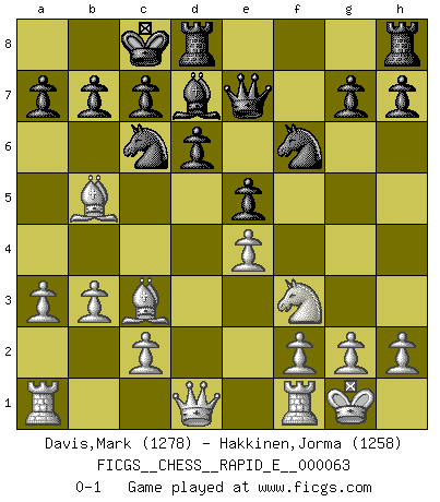 Last move : 0-1 2011 November 17 2:47:10 [Event "FICGS__CHESS__RAPID_E__000063"] [Site "FICGS"] [Date "2011.10.04"] [Round "1"] [White "Davis,Mark"] [Black "Hakkinen,Jorma"] [Result "0-1"] [WhiteElo "1278"] [BlackElo "1258"] 1.e4 e5 2.Nf3 Nc6 3.b3 f5 4.d3 Nf6 5.Nc3 fxe4 6.dxe4 Bb4 7.Bd2 d6 8.Bb5 Bd7 9.a3 Bxc3 10.Bxc3 Qe7 11.O-O O-O-O 0-1 King's pawn game Kingside Castling by player White (move 11) Queenside Castling by player Black (move 11) Player Black won this chess game. Follow this game move after move (download)Pawn endings are to Chess what putting is to golf. (Cecil Purdy) Lisa Lane, amerikanische Schachmeisterin, hatte Fischer einmal als stärksten lebenden Spieler bezeichnet. Antwort: Das ist richtig, aber Lisa Lane ist eigentlich nicht in der Lage, das zu beurteilen. (Robert James Fischer) El Rey es una pieza de pelea. ¡Usenlo!. (Wilhelm Steinitz) Je ne crois pas en la psychologie, je crois aux bons coups. (Robert Fischer) No, I am still playing. (Anatoly Karpov)