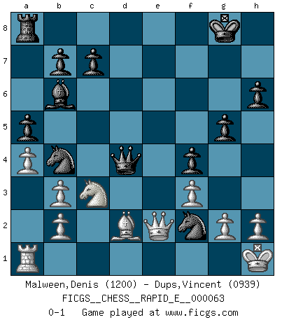 Last move : 0-1 2011 December 10 12:24:0 [Event "FICGS__CHESS__RAPID_E__000063"] [Site "FICGS"] [Date "2011.10.04"] [Round "1"] [White "Malween,Denis"] [Black "Dups,Vincent"] [Result "0-1"] [WhiteElo "1200"] [BlackElo "0939"] 1.e4 e5 2.d4 exd4 3.Nf3 Nc6 4.Nxd4 Bc5 5.Nb3 Bb6 6.Nc3 d6 7.Be2 Nf6 8.Bg5 h6 9.Bh4 Be6 10.O-O O-O 11.Kh1 g5 12.Bg3 Re8 13.Bd3 a5 14.a4 d5 15.exd5 Nxd5 16.Ne4 Ndb4 17.Re1 Bxb3 18.cxb3 Nxd3 19.Re2 Ncb4 20.f3 f5 21.Nc3 f4 22.Be1 Qd4 23.Bd2 Rxe2 24.Qxe2 Nf2+ 0-1 Centre game Kingside Castling by player White (move 10) Kingside Castling by player Black (move 10) Player Black won this chess game. Follow this game move after move (download)First-class players lose to second-class players because second-class players sometimes play a first-class game. (Siegbert Tarrasch) Schach sollte überall auf der Welt Schulfach werden. Es fördert die geistige Auseinandersetzung. Es lehrt die Demut in der Niederlage. (Garry Kasparov) El jugador táctico debe saber que hacer cuando algo se debe de hacer. El estratégico debe saber que hacer cuando nada se debe de hacer. (Savielly Tartakover) Les Echecs mettent en conflit, non pas deux intelligences, mais deux volontés. (Lasker) Memory is a crazy woman that hoards colored rags and throws away food. (Austin O'Malley)