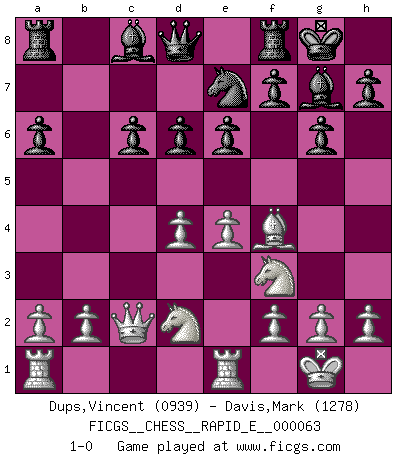 Last move : 1-0 2011 November 29 14:31:24 [Event "FICGS__CHESS__RAPID_E__000063"] [Site "FICGS"] [Date "2011.10.04"] [Round "1"] [White "Dups,Vincent"] [Black "Davis,Mark"] [Result "1-0"] [WhiteElo "0939"] [BlackElo "1278"] 1.e4 c5 2.Nf3 Nc6 3.Bb5 g6 4.O-O Bg7 5.Re1 d6 6.c3 a6 7.Bxc6+ bxc6 8.d4 cxd4 9.cxd4 e6 10.Bf4 Ne7 11.Nbd2 O-O 12.Qc2 1-0 This chess game has been lost on time (started : 2011.10.04 20:27:39) Sicilian : Nimzovich-Rossolimo attack (with ...g6, without ...d6) Kingside Castling by player White (move 4) Kingside Castling by player Black (move 11) Player White won this chess game. Follow this game move after move (download)Chess is played with the mind and not with the hands ! (Renaud and Kahn) Spielt Blackmar-Diemer-Gambit, und das Matt kommt von selbst! (Emil Joseph Diemer) Solo los afeminados hacen el Enroque. (Rob Sillars) Horreur, mais aussi harmonie suprême : qu'y avait-il en effet au monde en dehors des échecs ? Le brouillard, l'inconnu, le non-être... (Vladimir Nabokov) You can't play chess if you're groggy from pills. (Anatoly Karpov)
