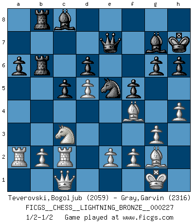 Last move : 1/2-1/2 2011 October 5 16:12:11 [Event "FICGS__CHESS__LIGHTNING_BRONZE__000227"] [Site "FICGS"] [Date "2011.10.05"] [Round "1"] [White "Teverovski,Bogoljub"] [Black "Gray,Garvin"] [Result "1/2-1/2"] [WhiteElo "2059"] [BlackElo "2316"] 1.d4 Nf6 2.c4 e6 3.Nc3 c5 4.d5 exd5 5.cxd5 d6 6.g3 g6 7.Bg2 Bg7 8.Nf3 O-O 9.O-O Re8 10.Nd2 Nbd7 11.h3 a6 12.a4 Rb8 13.Nc4 Ne5 14.Nxe5 Rxe5 15.Bf4 Re8 16.a5 Nh5 17.Bd2 b5 18.axb6 Qxb6 19.Qa4 Qd8 20.Qc2 Qe7 21.Rfe1 f5 22.Ra2 Nf6 23.Rd1 Qf7 24.Bf4 Qc7 25.Bf3 Qe7 26.h4 Nd7 27.Bg5 Qf7 28.Bg2 Rb4 29.Bf1 Ne5 30.Bf4 Bb7 31.Bg2 Rb8 32.Bf1 h6 33.Bg2 Bc8 34.Qc1 Kh7 35.Rd2 Qe7 36.Rc2 Ng4 37.Bd2 Rb3 38.Bf3 R8b6 39.Bf4 R6b4 40.Bd2 Rb8 41.Bf4 R3b4 42.Nd1 R4b6 43.Nc3 Ne5 44.Bg2 1/2-1/2 Queen's pawn game Kingside Castling by player Black (move 8) Kingside Castling by player White (move 9) This chess game ended in a draw. Follow this game move after move (download)Fischer Chess play was always razor-sharp, rational and brilliant. One of the best ever. (Dave Regis) Ich las kürzlich ein Buch von Nietzsche. Er sagte Religion verdumme nur die Menschen. Ich stimme zu. (Robert James Fischer) Nos gusta pensar. (Gary Kasparov) Tous ces prétendus hommes politiques sont les pions, les Cavaliers, les Tours ou les Fous d'une partie d'échecs qui se jouera tant qu'un hasard ne renversera pas l'échiquier. (Honoré de Balzac) Any activity becomes creative when the doer cares about doing it right or doing it better. (John Updike)