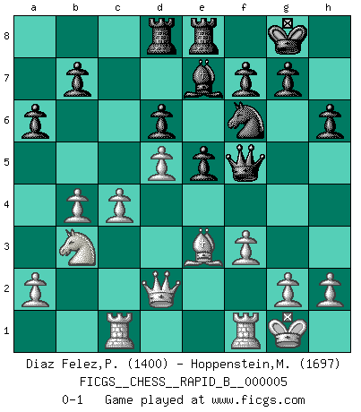 Last move : 0-1 2006 July 21 14:23:43 [Event "FICGS__CHESS__RAPID_B__000005"] [Site "FICGS"] [Date "2006.05.10"] [Round "1"] [White "Diaz Felez,Paco"] [Black "Hoppenstein,Michael"] [Result "0-1"] [WhiteElo "1400"] [BlackElo "1697"] 1.e4 c5 2.Nf3 d6 3.d4 cxd4 4.Nxd4 Nf6 5.Nc3 a6 6.Be3 e5 7.Nb3 Be6 8.Be2 Be7 9.Nd5 Nxd5 10.exd5 Bf5 11.O-O O-O 12.Qd2 Nd7 13.Na5 Qc7 14.c4 Rae8 15.b4 h6 16.Rac1 Rd8 17.f3 Rfe8 18.Nb3 Nf6 19.Bd3 Qd7 20.Bxf5 Qxf5 0-1 This chess game has been lost on time (started : 2006.05.10 11:52:43) Sicilian : Najdorf, Byrne (English) attack Kingside Castling by player White (move 11) Kingside Castling by player Black (move 11) Player Black won this chess game. Follow this game move after move (download)Avoid the crowd. Do your own thinking independently. Be the Chess player, not the Chess piece. (Ralph Charell) Im Wettkampf zwischen starken Meistern kommen Fehler sehr selten vor, deshalb ist es mit bloßem Warten nicht getan. (José Raúl Capablanca) En un gambito tu regalas un Peón por el bién de tomar un juego perdido. (Samuel Standige Boden) Il n'y a pas eu de défaite parce que je ne crois pas que cet ordinateur ait jamais existé. IBM a triché en refusant d'imprimer les modes de recherche de la machine. C'est évident, pendant le match, des coups décisifs ont été joués par des êtres humains. Aujourd'hui, les meilleurs spécialistes en informatique ne peuvent toujours pas expliquer comment Deep-Blue a pu jouer contre la logique des ordinateurs. IBM a gagné une guerre de communication, mais ils sont incapables de prouver que l'ordinateur a gagné tout seul. (Garry Kasparov) You can only get smarter by playing a smarter opponent. (Revolver, movie)