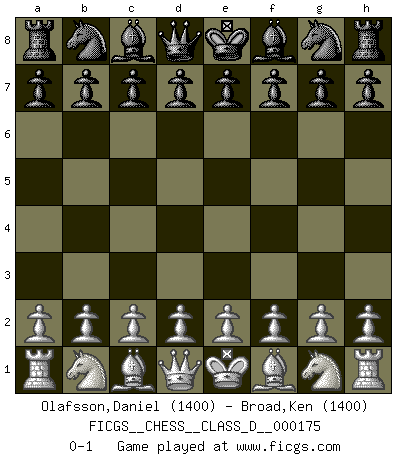 Last move : 0-1 2011 November 17 0:55:0 [Event "FICGS__CHESS__CLASS_D__000175"] [Site "FICGS"] [Date "2011.10.07"] [Round "1"] [White "Olafsson,Daniel"] [Black "Broad,Ken"] [Result "0-1"] [WhiteElo "1400"] [BlackElo "1400"] 0-1 This chess game has been lost on time (started : 2011.10.07 17:0:46) Player Black won this chess game. Follow this game move after move (download)Chess, like love, is infectious at any age. (Flohr) Kostenjuk hat keinen Sexappeal. (Loek van Wely) Fischer era un maestro de claridad y un Rey del posicionamiento astuto. Sus oponentes podían ver hacia donde se dirigía pero eran impotentes para detenerlo. (Bruce Pandolfini) On croit qu'il y a plus de mauvais joueurs que de bons joueurs, c'est faux : Il y a autant de joueurs qui gagnent que de joueurs qui perdent. (Philippe Geluck) Opportunities multiply as they are seized. (Sun Tzu)