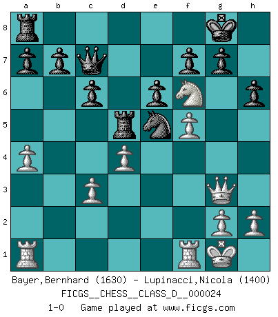 Last move : 1-0 2007 January 12 19:51:42 [Event "FICGS__CHESS__CLASS_D__000024"] [Site "FICGS"] [Date "2007.01.03"] [Round "1"] [White "Bayer,Bernhard"] [Black "Lupinacci,Nicola"] [Result "1-0"] [WhiteElo "1630"] [BlackElo "1400"] 1.d4 d5 2.c4 c6 3.Nf3 Nf6 4.Nc3 dxc4 5.a4 Bf5 6.e3 e6 7.Bxc4 Nbd7 8.O-O Bb4 9.Bd3 Bxd3 10.Qxd3 Qc7 11.e4 Be7 12.e5 Nd5 13.Bg5 Bxg5 14.Nxg5 h6 15.Nge4 O-O 16.f4 Rfd8 17.f5 Nxc3 18.bxc3 Nxe5 19.Qg3 Rd5 20.Nf6+ 1-0 QGD Slav : Dutch variation Kingside Castling by player White (move 8) Kingside Castling by player Black (move 15) Player White won this chess game. Follow this game move after move (download)Suddenly it was obvious to me in my analysis I had missed what Fischer had found with the greatest of ease at the board. (Mikhail Botvinnik) Matt entspricht nicht immer den Tatsachen. (Savielly Grigorievitsch Tartakower) Cada Peón es potencialmente una Reina. (James Mason) La tactique est l'élément le plus important du milieu de jeu. (Siegbert Tarrasch) Perhaps the current trend of many chess professionals taking up the more lucrative pastime of poker is not a wholly negative one. It may not be too late for humans to relearn how to take risks in order to innovate and thereby maintain the advanced lifestyles we enjoy. And if it takes a poker-playing supercomputer to remind us that we can't enjoy the rewards without taking the risks, so be it. (The Chess Master and the Computer, by Garry Kasparov - 2010)
