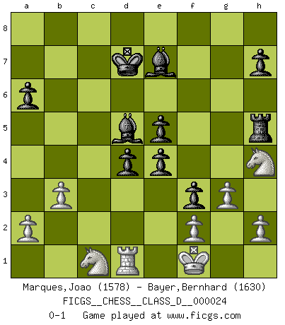 Last move : 0-1 2007 March 1 13:53:54 [Event "FICGS__CHESS__CLASS_D__000024"] [Site "FICGS"] [Date "2007.01.03"] [Round "1"] [White "Marques,Joao"] [Black "Bayer,Bernhard"] [Result "0-1"] [WhiteElo "1578"] [BlackElo "1630"] 1.e4 c5 2.Nf3 d6 3.d4 cxd4 4.Nxd4 Nf6 5.Nc3 a6 6.Be2 e6 7.Be3 Qc7 8.Qd2 b5 9.Bf3 Bb7 10.Bg5 Nbd7 11.O-O Ne5 12.Bxf6 gxf6 13.Rad1 Rg8 14.g3 Nxf3+ 15.Nxf3 f5 16.Qe3 b4 17.Ne2 fxe4 18.Nfd4 e5 19.Nf5 d5 20.c3 Qc8 21.Nh4 bxc3 22.Qxc3 d4 23.Qxc8+ Rxc8 24.Rc1 Rd8 25.Rc7 Rd7 26.Rfc1 Kd8 27.Rxd7+ Kxd7 28.Nf5 Rg5 29.Nh4 Bd5 30.b3 f5 31.Kf1 Rh5 32.Kg1 f4 33.Rd1 Bc5 34.Nc1 f3 35.Kf1 Be7 0-1 Sicilian : Najdorf, Opovcensky variation Kingside Castling by player White (move 11) Player Black won this chess game. Follow this game move after move (download)The passion for playing Chess is one of the most unaccountable in the world. (H.G. Wells) Mein erstes Ziel war nicht, die Partie zu gewinnen, sondern eine Figur zu opfern. -- der junge (Wilhelm Steinitz) El ganar no lo es todo... pero el perder es nada. (Mednis) Le thème de l'attaque double intervient d'une manière ou d'une autre dans l'immense majorité des combinaisons. (Youri Averbakh) Macintosh - we might not get everything right, but at least we knew the century was going to end. (Douglas Adams)