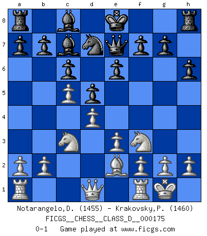 Last move : 0-1 2012 January 8 5:40:14 [Event "FICGS__CHESS__CLASS_D__000175"] [Site "FICGS"] [Date "2011.10.07"] [Round "1"] [White "Notarangelo,Domenico"] [Black "Krakovsky,Peter"] [Result "0-1"] [WhiteElo "1455"] [BlackElo "1460"] 1.d4 d5 2.c4 c6 3.Nf3 e6 4.Nc3 Nf6 5.Bg5 h6 6.Bxf6 Qxf6 7.e3 Nd7 8.Be2 Bd6 9.O-O Qe7 10.c5 Bc7 0-1 This chess game has been lost on time (started : 2011.10.07 17:0:46) QGD Slav : 3.Nf3 Kingside Castling by player White (move 9) Player Black won this chess game. Follow this game move after move (download)I love all positions. Give me a difficult positional game, I will play it. But totally won positions, I cannot stand them. (Hein Donner) Wenn Dein Gegner dir ein Remis anbietet, versuch herauszufinden, weshalb er glaubt schlechter zu stehen. (Nigel Short) El Ajedrez es tan inspirador que yo no creo que un buen jugador sea capaz de tener un pensamiento malo durante una partida. (Wilhelm Steinitz) Ce qui est bien, c'est d'avoir tout un tas de pièces en prise : l'adversaire ne peut en prendre qu'une à la fois. Cité par Thierry Audin. If you have any trouble condescending, find a Unix user to show you how it's done. (Scott Adams)