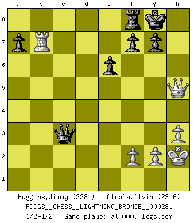 Last move : 1/2-1/2 2011 October 8 19:12:14 [Event "FICGS__CHESS__LIGHTNING_BRONZE__000231"] [Site "FICGS"] [Date "2011.10.08"] [Round "1"] [White "Huggins,Jimmy"] [Black "Alcala,Alvin"] [Result "1/2-1/2"] [WhiteElo "2281"] [BlackElo "2316"] 1.d4 Nf6 2.c4 c6 3.Nc3 d5 4.Nf3 e6 5.e3 Nbd7 6.Qc2 Bd6 7.Bd3 dxc4 8.Bxc4 O-O 9.O-O b5 10.Bd3 Bb7 11.Ng5 h6 12.Nge4 Be7 13.Bd2 Rc8 14.Nxf6+ Nxf6 15.Rfd1 c5 16.Bxb5 cxd4 17.exd4 Qxd4 18.Be2 Qe5 19.Be3 Nd5 20.Bd4 Qg5 21.Bf3 Nb4 22.Qe2 Bxf3 23.Qxf3 Nc2 24.Be3 Qa5 25.Rab1 Bb4 26.Bd2 Rfd8 27.h3 Nd4 28.Qg4 h5 29.Qe4 Nb5 30.Qf3 Bxc3 31.Bxc3 Nxc3 32.Rxd8+ Rxd8 33.bxc3 Qxa2 34.Rb7 Qa1+ 35.Kh2 Rf8 36.Qxh5 Qxc3 1/2-1/2 Queen's pawn game Kingside Castling by player Black (move 8) Kingside Castling by player White (move 9) This chess game ended in a draw. Follow this game move after move (download)The Chess pieces are the block alphabet which shapes thoughts; and these thoughts, although making a visual design on the chessboard, express their beauty abstractly, like a poem. (Marcel Duchamp) Karpov ist ein Museumsstück. (Garry Kasparov) ¡Examina movidas que hagan daño! Un buen ojo for movidas desvastantes es mucho mas importante que el conocimiento de principios estratégicos. (Purdy) La tactique, c'est ce que vous faites quand il y a quelque chose à faire; la stratégie, c'est ce que vous faites quand il n'y a rien à faire. (Savielli Tartacower) It is not enough to be a good player... you must also play well. (Siegbert Tarrasch)