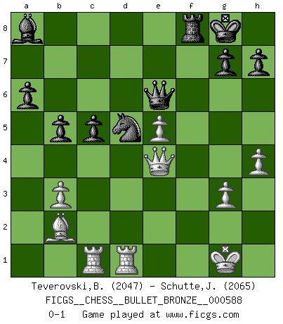 Last move : 0-1 2011 October 9 23:43:36 [Event "FICGS__CHESS__BULLET_BRONZE__000588"] [Site "FICGS"] [Date "2011.10.09"] [Round "1"] [White "Teverovski,Bogoljub"] [Black "Schutte,John"] [Result "0-1"] [WhiteElo "2047"] [BlackElo "2065"] 1.d4 d5 2.c4 e6 3.Nf3 Nf6 4.g3 dxc4 5.Bg2 a6 6.O-O Nc6 7.e3 Bd7 8.Qe2 b5 9.b3 cxb3 10.axb3 Bd6 11.e4 e5 12.Rd1 O-O 13.Bb2 exd4 14.Nxd4 Re8 15.Qe3 Nxd4 16.Bxd4 Bc6 17.Nd2 Bb7 18.Bf3 Nd5 19.Qe2 Bb4 20.Rac1 c5 21.Bb2 Qg5 22.h4 Qe7 23.e5 f5 24.Bh5 Rf8 25.Nf1 Qe6 26.Bf3 Rad8 27.Nd2 Bxd2 28.Qxd2 f4 29.Qe2 fxg3 30.fxg3 Rxf3 31.Qxf3 Rf8 32.Qe4 Ba8 0-1 This chess game has been lost on time (started : 2011.10.09 18:15:1) Queen's gambit declined Kingside Castling by player White (move 6) Kingside Castling by player Black (move 12) Player Black won this chess game. Follow this game move after move (download)He who takes the Queen's Knight's Pawn will sleep in the streets. (Anonymous) Besser ein falscher Plan, logisch durchgeführt, als gar kein Plan. (Viktor Kortschnoi) El arma más poderosa en el Ajedrez, es tener la próxima movida. (David Bronstein) Il n'y a plus de joueurs du niveau de Jacob Murray dont la seule quête est le beau jeu, le plaisir de voir les pièces construire quelque chose. Sur 10 idées à la minute, 9 seront sans intérêt, la dernière s'avèrera géniale. (Christian Bauer) Never risk one's whole fortune unless supported by one's entire army. (Niccolo Machiavelli)