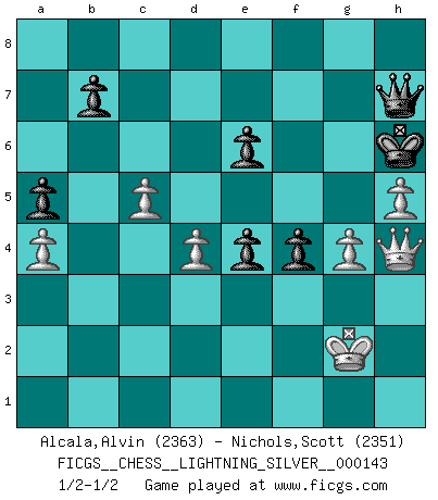 Last move : 1/2-1/2 2011 October 9 21:12:55 [Event "FICGS__CHESS__LIGHTNING_SILVER__000143"] [Site "FICGS"] [Date "2011.10.09"] [Round "1"] [White "Alcala,Alvin"] [Black "Nichols,Scott"] [Result "1/2-1/2"] [WhiteElo "2363"] [BlackElo "2351"] 1.e4 c6 2.d4 d5 3.e5 Bf5 4.Bd3 Bxd3 5.Qxd3 e6 6.Ne2 c5 7.c3 Nc6 8.O-O Nge7 9.Nd2 Rc8 10.a3 cxd4 11.cxd4 Nf5 12.b4 Be7 13.Nb3 O-O 14.Bd2 a6 15.Ng3 Nh4 16.Rac1 Qb6 17.Nc5 Rc7 18.f4 g6 19.Ne2 Rfc8 20.g3 Nf5 21.g4 Ng7 22.Nc3 f5 23.exf6 Bxf6 24.Be3 Rf7 25.Ne2 Qb5 26.Qd2 Bh4 27.Kh1 Nd8 28.Nc3 Qe8 29.a4 Nc6 30.Ne2 Be7 31.Ng1 Bxc5 32.bxc5 Qd7 33.Nf3 Rcf8 34.Rce1 Ne8 35.Ng5 Re7 36.Qd3 Nf6 37.Rg1 Nb4 38.Qb3 Nc6 39.Qb1 Qe8 40.Rg2 Kg7 41.Qb2 Nd8 42.Qb3 Nc6 43.Qd1 a5 44.Qe2 h6 45.Nh3 Ne4 46.Nf2 Nb4 47.Reg1 Kh7 48.h4 Rg7 49.Qd1 Qc6 50.h5 g5 51.fxg5 hxg5 52.Qb1 Rf3 53.Rg3 Rgf7 54.Nxe4 dxe4 55.Kh2 Nd3 56.Qb3 Qd7 57.Qc4 Kh6 58.Qb3 Nb4 59.Rxf3 Rxf3 60.Rg3 Rxg3 61.Kxg3 Qc7+ 62.Kg2 Nd5 63.Bc1 Qf7 64.Qg3 Nf4+ 65.Bxf4 gxf4 66.Qe1 Qh7 67.Qh4 1/2-1/2 Caro-Kann : Advance variation Kingside Castling by player White (move 8) Kingside Castling by player Black (move 13) This chess game ended in a draw. Follow this game move after move (download)No price is too great for the scalp of the enemy King. (Koblentz) Jeder weiß, dass Gasprom Putins persönliches Machtinstrument ist. Die Firma wird vom Kreml aus geleitet und wird schon deshalb nie transparent sein. (Garry Kasparov) El Ajedrez, como cualquier otra actividad creativa, puede existir solo a través de méritos combinados de aquellos que tienen talento creativo y de aquellos que tienen la habilidad de organizar un trabajo creativo. (Mikhail Botvinnik) La vérité est comme le meilleur coup aux échecs : elle existe, mais il faut la chercher. (Arturo Perez-Reverte) Life is the sum of all your choices. (Albert Camus)