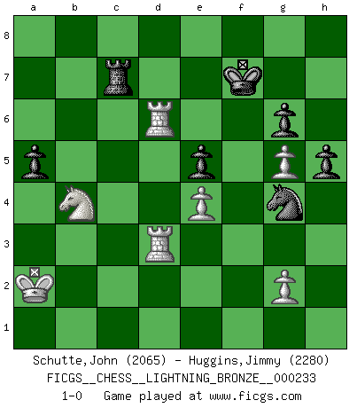 Last move : 1-0 2011 October 9 22:14:19 [Event "FICGS__CHESS__LIGHTNING_BRONZE__000233"] [Site "FICGS"] [Date "2011.10.09"] [Round "1"] [White "Schutte,John"] [Black "Huggins,Jimmy"] [Result "1-0"] [WhiteElo "2065"] [BlackElo "2280"] 1.e4 c5 2.Nf3 d6 3.d4 cxd4 4.Nxd4 Nf6 5.Nc3 a6 6.Bg5 e6 7.Qf3 Nbd7 8.O-O-O h6 9.Be3 h5 10.h4 Ne5 11.Qg3 Qc7 12.Be2 Bd7 13.a3 Rc8 14.Kb1 b5 15.Rhe1 Nc4 16.Bxc4 Qxc4 17.Bg5 b4 18.axb4 Qxb4 19.Nb3 Ng4 20.Bf4 e5 21.Bg5 Rxc3 22.Qxc3 Qxc3 23.bxc3 Nxf2 24.Rd2 Ng4 25.c4 g6 26.c5 f6 27.cxd6 fxg5 28.hxg5 Rh7 29.Nc5 Bb5 30.c4 Bxc4 31.Red1 Bb5 32.d7+ Bxd7 33.Nxd7 Bb4 34.Rd5 Re7 35.R1d3 a5 36.Ka2 Be1 37.Nb8 Rc7 38.Rd6 Kf7 39.Nc6 Bb4 40.Nxb4 1-0 Sicilian : Najdorf, 6...e6 Queenside Castling by player White (move 8) Player White won this chess game. Follow this game move after move (download)Many Chess players were surprised when after the game, Fischer quietly explained: 'I had already analyzed this possibility' in a position which I thought was not possible to foresee from the opening. (Mikhail Tal) Die Idee von Capablanca, Schach als Fach in den Schulen zu lehren, ist großartig. (Fidel Castro) Yo creo que el Ajedrez posee una magia que es también una ayuda en la edad avanzada. Una rodilla reumática es olvidada durante una partida de Ajedrez y otros eventos pueden parecer algo sin importancia comparada a una catástrofe en el tablero de Ajedrez. (Vlastimil Hort) Le joueur d'Echecs qui veut atteindre le top est obligé de développer son propre credo créatif. Alexeï Stepanovicth Souétine. Il est facile d'écrire des livres ! Ce qui est difficile, c'est de jouer ! (Alexeï Stepanovicth Souétine) Just because you do not take an interest in politics doesn't mean politics won't take an interest in you. (Pericles 430 B.C.)