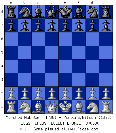 Last move : 0-1 2011 October 9 23:43:36 [Event "FICGS__CHESS__BULLET_BRONZE__000590"] [Site "FICGS"] [Date "2011.10.09"] [Round "1"] [White "Morshed,Mukhtar"] [Black "Pereira,Nilson"] [Result "0-1"] [WhiteElo "1798"] [BlackElo "1878"] 0-1 This chess game has been lost on time (started : 2011.10.09 21:55:40) Player Black won this chess game. Follow this game move after move (download)A strong memory, concentration, imagination, and a strong will is required to become a great Chess player. (Bobby Fischer) Frage: Gibt es etwas was Sie mehr lieben als Autobahnen ohne Tempobegrenzungen? - Antwort: Deutsche Frauen ohne Tempobegrenzungen. (Loek van Wely) Jugadores de primera clase pierden en contra de jugadores de segunda clase porque los jugadores de segunda clase a veces juegan una partida de primer clase. (Siegbert Tarrasch) Mais n'est-ce pas déjà le limiter injurieusement que d'appeler les échecs un jeu? N'est-ce pas aussi une science, un art, ou quelque chose qui, comme le cercueil de Mahomet entre ciel et terre, est suspendu entre l'un et l'autre, et qui réunit un nombre incroyable de contraires ? (Stefan Zweig) Memory is a complicated thing, a relative to truth, but not its twin. (Barbara Kingsolver, Animal Dreams)