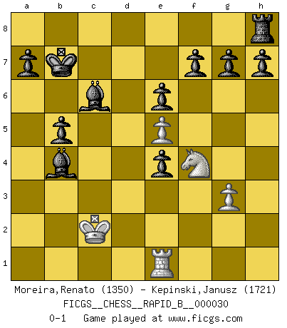 Last move : 0-1 2007 March 11 4:54:59 [Event "FICGS__CHESS__RAPID_B__000030"] [Site "FICGS"] [Date "2007.01.03"] [Round "1"] [White "Moreira,Renato"] [Black "Kepinski,Janusz"] [Result "0-1"] [WhiteElo "1350"] [BlackElo "1721"] 1.e4 e6 2.d4 d5 3.Nc3 Nf6 4.e5 Ne4 5.Nxe4 dxe4 6.Be3 c5 7.Bb5+ Bd7 8.Qe2 Qa5+ 9.Bd2 Qxb5 10.Bc3 Na6 11.Qxb5 Bxb5 12.O-O-O O-O-O 13.Nh3 Be7 14.Rhe1 Bc6 15.Nf4 b5 16.Ba5 Rxd4 17.c3 Ra4 18.b4 cxb4 19.Bxb4 Nxb4 20.cxb4 Rxa2 21.Kb1 Rxf2 22.g3 Rxh2 23.Rc1 Kb7 24.Rc2 Rxc2 25.Kxc2 Bxb4 0-1 French : Steinitz variation Queenside Castling by player White (move 12) Queenside Castling by player Black (move 12) Player Black won this chess game. Follow this game move after move (download)Chess is a terrible game. If you have no center, your opponent has a freer position. If you do have a center, then you really have something to worry about ! (Siegbert Tarrasch) Wenn ich einen Club besuche, sind die Spieler stumm vor Staunen. (José Raúl Capablanca) Nos gusta pensar. (Gary Kasparov) D'abord les bases : Jouez et étudiez, puis étudiez et jouez, ensuite jouez et étudiez, puis étudiez et jouez. Deuxièmement : Donnez toujours le meilleur de vous-même ! (Ken Smith) To err is human, to shift the blame on someone else is tactical. (Mladen Jankovic)