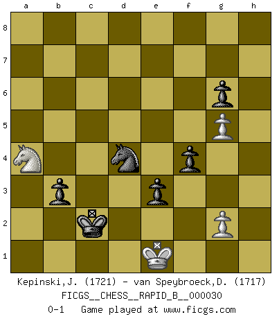 Last move : 0-1 2007 April 5 22:4:40 [Event "FICGS__CHESS__RAPID_B__000030"] [Site "FICGS"] [Date "2007.01.03"] [Round "1"] [White "Kepinski,Janusz"] [Black "van Speybroeck,Dirk-Jan"] [Result "0-1"] [WhiteElo "1721"] [BlackElo "1717"] 1.f4 Nf6 2.Nf3 d6 3.e3 g6 4.d4 Bg7 5.Bd3 Nbd7 6.O-O O-O 7.c4 c5 8.Nc3 cxd4 9.exd4 b6 10.Qe2 Bb7 11.f5 a6 12.fxg6 hxg6 13.Bg5 Re8 14.Rad1 Rc8 15.d5 Nc5 16.Bc2 b5 17.cxb5 axb5 18.b4 Ncd7 19.Rd3 Rc4 20.Qd2 Ng4 21.Nb1 Qb6+ 22.Kh1 Nde5 23.Nxe5 Nxe5 24.Rg3 Bxd5 25.Bb3 Rd4 26.Be3 Rxd2 27.Bxb6 Bxb3 28.Nxd2 Bxa2 29.Bd4 Nc6 30.Bxg7 Kxg7 31.Ra1 Bd5 32.Rb1 Ra8 33.h3 Ra2 34.Nf3 e5 35.Ne1 Nd4 36.Rd1 Rb2 37.Kh2 f5 38.Nd3 Ra2 39.Rf1 Bc4 40.Rf2 f4 41.Rg4 Rxf2 42.Nxf2 Be2 43.Ne4 Bxg4 44.hxg4 Kf7 45.Nxd6+ Ke6 46.Ne4 Kd5 47.Nf6+ Kc4 48.Nd7 e4 49.g5 Kxb4 50.Kg1 Kc3 51.Nc5 e3 52.Kf1 b4 53.Ke1 b3 54.Na4+ Kc2 0-1 Bird's Opening Kingside Castling by player White (move 6) Kingside Castling by player Black (move 6) 10 pieces endgame at move 49 : White KNPP , Black KNPPPP WHITE : King + 1 Knight 2 Pawns BLACK : King + 1 Knight 4 Pawns Player Black won this chess game. Follow this game move after move (download)Nonsense was the last thing Fischer was interested in, as far as Chess was concerned. (Elie Agur) Was ist der Unterschied zwischen einem Strassenarbeiter und einem Schachspieler? --Der Schachspieler bewegt sich ab und zu. (Anonymous) Dios mío, Bobby Fischer juega tan simple. (Alexei Suetin) C'est la seule position que je connaisse où les deux camps sont mals. Propos prêtés à V. Anand. 'preceded by its own quotation yields a falsehood' preceded by its own quotation yields a falsehood. (W. V. O. Quine - Set Theory And Its Logic, 1953)