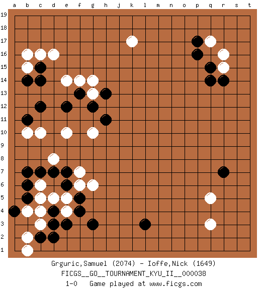 Last move : 1-0 2011 November 15 17:59:37 [Event "FICGS__GO__TOURNAMENT_KYU_II__000038 "] [Site "FICGS"] [Date "2011.10.09"] [Round "1"] [Black "Grguric,Samuel "] [White "Ioffe,Nick "] [Result "1-0"] [Rating 1 "2074"] [Rating 2 "1649"] 1.p16 r16 2.q15 r15 3.q14 d16 4.r14 q17 5.p17 q5 6.e3 q3 7.l3 c4 8.c7 e4 9.f4 e5 10.d3 c3 11.d4 d5 12.g3 c10 13.e7 k17 14.f5 c6 15.c14 b15 16.c12 e10 17.b7 e14 18.c15 c16 19.b14 b16 20.b11 b10 21.e12 g13 22.g12 g10 23.f13 f14 24.h13 g14 25.h11 d8 26.d7 f6 27.e6 g6 28.b5 c5 29.b6 b4 30.c2 b2 31.d2 b1 32.a4 f7 33.r7 1-0 Here are the names of the openings (joseki) played in the four corners : Corner q16 : p16 r16Takamoku (Gomok, Gaomu`) 5-4 Point. The takamoku (high) point (5-4). With its emphasis on influence, the 5-4 point complements the 4-4 (hoshi) point in creating an influence-oriented fuseki.Komoku. Black responds with 3-3, 3-5, 4-6, 4-7, 3-6, 3-7. Corner d4 : e3 c4Mokuhazushi (Waemok, Wai`mu`) 5-3 Point. The mokuhazushi (5-3) point was popular in the Edo period in Japan (1600 - 1867). It emphasizes influence; territorially, it is inferior to the 3-4 point.Komoku Kakari. White 2 is the standard approach because of its solidity and stability. Corner d16 : d16 c14Hoshi (Hwajeom, Seongjeom, Xingwei`) 4-4 Point. The star or hoshi (4-4) point, emphasizing influence at the potential expense of territory.Ikken Kakari (Hankan Keolch'im, Yi Gua`jiao~, 1-Space Low Approach). Black 2 is the standard approach move to the 4-4. Player Black won this Go (weiqi, baduk) game.Follow this game move after move (download ) Josekis are not fixed, definitive things. They indicate the moments when everything can change. (Pierre Audouard) Train yourself to let go of everything you fear to lose. (Master Yoda in Star Wars ep.3)