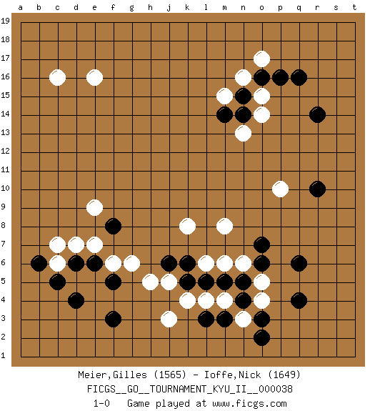 Last move : 1-0 2011 November 8 5:53:37 [Event "FICGS__GO__TOURNAMENT_KYU_II__000038"] [Site "FICGS"] [Date "2011.10.09"] [Round "1"] [Black "Meier,Gilles"] [White "Ioffe,Nick"] [Result "1-0"] [Rating 1 "1565"] [Rating 2 "1649"] 1.q16 o17 2.d4 c16 3.q4 c6 4.f3 e16 5.r14 o14 6.o16 n16 7.n15 o15 8.p16 m15 9.d6 d7 10.e6 e7 11.c5 f6 12.f5 g6 13.b6 c7 14.r10 p10 15.o3 o5 16.q6 n3 17.o2 j3 18.n4 o4 19.m3 m4 20.n5 n6 21.m5 l4 22.l3 k4 23.o6 m6 24.l5 l6 25.k5 j5 26.k6 m8 27.j6 h5 28.o7 k8 29.f8 e9 30.n14 n13 31.m14 1-0 Here are the names of the openings (joseki) played in the four corners : Corner q16 : q16 o17 Hoshi (Hwajeom, Seongjeom, Xingwei`) 4-4 Point. The star or hoshi (4-4) point, emphasizing influence at the potential expense of territory. Ikken Kakari (Hankan Keolch'im, Yi Gua`jiao~, 1-Space Low Approach). White 2 is the standard approach move to the 4-4. Corner d4 : d4 c6 Hoshi (Hwajeom, Seongjeom, Xingwei`) 4-4 Point. The star or hoshi (4-4) point, emphasizing influence at the potential expense of territory. Ikken Kakari (Hankan Keolch'im, Yi Gua`jiao~, 1-Space Low Approach). White 2 is the standard approach move to the 4-4. Player Black won this Go (weiqi, baduk) game. Follow this game move after move (download)White is always trying to kill a bigger group than black is trying to save. (Anonymous) If you are going through hell, keep going. (Winston Churchill)