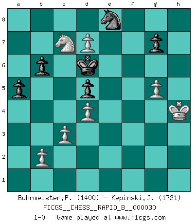 Last move : 1-0 2007 May 1 1:20:32 [Event "FICGS__CHESS__RAPID_B__000030"] [Site "FICGS"] [Date "2007.01.03"] [Round "1"] [White "Buhrmeister,Peter"] [Black "Kepinski,Janusz"] [Result "1-0"] [WhiteElo "1400"] [BlackElo "1721"] 1.e4 e6 2.d4 d5 3.e5 b6 4.c3 Qd7 5.Nf3 Ne7 6.a4 a5 7.Na3 Ba6 8.Nb5 Ng6 9.h4 h5 10.Bd3 c6 11.Bxg6 cxb5 12.axb5 Bxb5 13.Bd3 Be7 14.Bg5 Bxd3 15.Qxd3 Nc6 16.O-O Bxg5 17.hxg5 h4 18.g6 fxg6 19.Qxg6+ Qf7 20.Qg4 Ne7 21.Ng5 Qg6 22.f4 Nf5 23.Qe2 O-O 24.Qd3 Rac8 25.Qb5 Ng3 26.Rf2 Rb8 27.Qc6 Rxf4 28.Qxe6+ Qxe6 29.Nxe6 Re4 30.Kh2 Re8 31.Nc7 Rd8 32.Kh3 Re3 33.Rf3 Re2 34.Kxh4 Ne4 35.e6 Nf6 36.Rf5 Kf8 37.Re5 Re4+ 38.Rxe4 Nxe4 39.Rf1+ Nf6 40.g4 Ke7 41.g5 Ne8 42.Rf7+ Kd6 43.Rd7+ Rxd7 44.exd7 1-0 This chess game has been lost on time (started : 2007.01.03 21:24:42) French : Advance variation Kingside Castling by player White (move 16) Kingside Castling by player Black (move 23) Player White won this chess game. Follow this game move after move (download)The mistakes are there, waiting to be made. (Savielly Tartakower) Kein Schachspieler kann gut schlafen. (H. G. Wells) No hay precio que no valga la pena por la cabellera del Rey enemigo. (Koblentz) Les échecs, c'est la lutte contre l'erreur. (Johannes Zukertort) I don't believe in psychology. I believe in good moves. (Bobby Fischer)