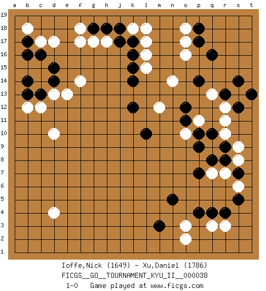 Last move : 1-0 2011 November 15 8:38:12 [Event "FICGS__GO__TOURNAMENT_KYU_II__000038"] [Site "FICGS"] [Date "2011.10.09"] [Round "1"] [Black "Ioffe,Nick"] [White "Xu,Daniel"] [Result "1-0"] [Rating 1 "1649"] [Rating 2 "1786"] 1.q16 d4 2.q4 d17 3.q10 d10 4.k16 o3 5.m3 r3 6.r4 q3 7.p4 o2 8.n5 o17 9.p17 o16 10.p14 l17 11.k17 n14 12.o12 k18 13.j18 l16 14.k14 l15 15.k15 l18 16.p18 m12 17.d15 h17 18.h18 f17 19.g18 g17 20.j17 f18 21.k12 d13 22.l10 o18 23.c16 c17 24.b17 b18 25.b16 f14 26.c13 c12 27.d14 e13 28.b13 b12 29.b14 r10 30.r9 r11 31.r13 s9 32.r8 s8 33.s7 s13 34.s12 r12 35.s14 q13 36.t13 p11 37.p10 o10 38.o11 q9 39.p9 r7 40.q8 s6 41.s5 q7 42.p7 1-0 Here are the names of the openings (joseki) played in the four corners : Corner q4 : q4 o3 Hoshi (Hwajeom, Seongjeom, Xingwei`) 4-4 Point. The star or hoshi (4-4) point, emphasizing influence at the potential expense of territory. Ikken Kakari (Hankan Keolch'im, Yi Gua`jiao~, 1-Space Low Approach). White 2 is the standard approach move to the 4-4. Corner q16 : q16 o17 Hoshi (Hwajeom, Seongjeom, Xingwei`) 4-4 Point. The star or hoshi (4-4) point, emphasizing influence at the potential expense of territory. Ikken Kakari (Hankan Keolch'im, Yi Gua`jiao~, 1-Space Low Approach). White 2 is the standard approach move to the 4-4. Corner d16 : d17 j18 Komoku (Somok, Xiao~mu`) 3-4 Point. The komoku (3-4) point is the traditional corner enclosure move.. Player Black won this Go (weiqi, baduk) game. Follow this game move after move (download)Proverbs do not apply to White. (Tero Sand) Philosophers use a language that is already deformed as though by shoes that are too tight. (Ludwig Wittgenstein)