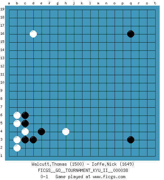 Last move : 0-1 2011 November 16 0:51:25 [Event "FICGS__GO__TOURNAMENT_KYU_II__000038"] [Site "FICGS"] [Date "2011.10.09"] [Round "1"] [Black "Walcutt,Thomas"] [White "Ioffe,Nick"] [Result "0-1"] [Rating 1 "1500"] [Rating 2 "1649"] 1.q16 d16 2.q3 c4 3.e4 h4 4.c3 b3 5.d3 b2 6.c5 b5 7.c6 b6 0-1 This go game has been lost on time (started : 2011.10.09 23:25:6) Here are the names of the openings (joseki) played in the four corners : Corner d4 : c4 e4 Komoku (Somok, Xiao~mu`) 3-4 Point. The komoku (3-4) point is the traditional corner enclosure move.. Ikken Takagakari (Hankan Nop'dakeolch'im, Yi Gaogua`jiao~, 1-Space High Approach). The 5-4 approach move has become more popular in modern times, as modern Go emphasizes speed and influence. Player White won this Go (weiqi, baduk) game. Follow this game move after move (download)The intersection is rarely neutral. (Pierre Audouard) Hardware: the parts of a computer that can be kicked. (Jeff Persis)