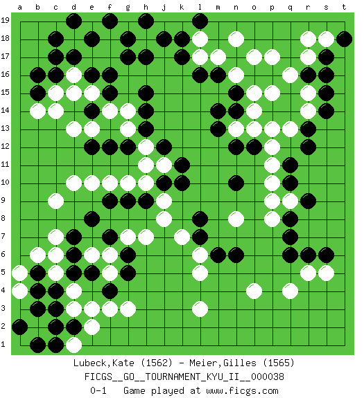 Last move : 0-1 2012 January 2 19:54:20 [Event "FICGS__GO__TOURNAMENT_KYU_II__000038"] [Site "FICGS"] [Date "2011.10.09"] [Round "1"] [Black "Lubeck,Kate"] [White "Meier,Gilles"] [Result "0-1"] [Rating 1 "1562"] [Rating 2 "1565"] 1.r16 d4 2.c16 q4 3.k17 p17 4.n17 p15 5.r13 r18 6.s17 e17 7.g17 e15 8.d17 d18 9.c18 d16 10.c17 c15 11.b15 c14 12.e18 f18 13.d19 f17 14.h17 b14 15.b16 l3 16.r6 r5 17.q6 c7 18.k10 j8 19.l8 k7 20.l7 l6 21.m6 l5 22.n6 o4 23.c3 d3 24.c4 c5 25.d2 e2 26.b5 b6 27.d5 c6 28.c2 f3 29.b4 d1 30.c1 a5 31.a2 b2 32.b3 a4 33.b1 j19 34.g18 g19 35.h19 h18 36.j18 k19 37.h19 l18 38.f19 l17 39.l16 m17 40.m16 n18 41.k18 n16 42.l19 o17 43.n15 o15 44.n14 h10 45.j12 h12 46.h13 g13 47.h14 j11 48.k11 g14 49.h15 p13 50.o12 p12 51.q11 p11 52.q10 p10 53.n10 p8 54.q8 q9 55.r9 p9 56.q7 s5 57.s6 s18 58.t18 r17 59.s16 o13 60.n12 n13 61.m13 o14 62.m14 r14 63.s14 r15 64.s15 q13 65.r12 q16 66.g12 h11 67.f12 d10 68.f15 f14 69.e14 e13 70.f16 d15 71.e16 n8 72.e5 g3 73.e8 c9 74.h9 j9 75.j10 g10 76.g9 f10 77.e12 d13 78.f9 e10 79.g6 g7 80.f7 h7 81.d7 e6 82.d6 f5 83.f4 e3 84.g5 f6 0-1 Here are the names of the openings (joseki) played in the four corners : Corner q16 : r16 p17 Komoku (Somok, Xiao~mu`) 3-4 Point. The komoku (3-4) point is the traditional corner enclosure move.. Ikken Kakari (Hankan Keolch'im, Yi Gua`jiao~, 1-Space Low Pincer). The small knight move is the basic approach move to the 3-4 point stone. It has been continually used for over four centuries. There are limitless variations, with new moves constantly being discovered. White 2 opens the door to a treaure store of joseki. Corner d16 : c16 e17 Komoku (Somok, Xiao~mu`) 3-4 Point. The komoku (3-4) point is the traditional corner enclosure move.. Ikken Kakari (Hankan Keolch'im, Yi Gua`jiao~, 1-Space Low Pincer). The small knight move is the basic approach move to the 3-4 point stone. It has been continually used for over four centuries. There are limitless variations, with new moves constantly being discovered. White 2 opens the door to a treaure store of joseki. Player White won this Go (weiqi, baduk) game. Follow this game move after move (download)If you lose by one point, take a rest. (Anonymous) If we don't succeed, we run the risk of failure. (George W. Bush)