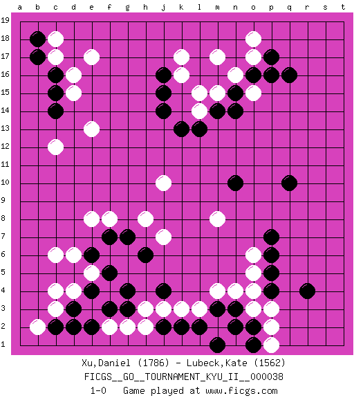 Last move : 1-0 2012 January 10 19:38:9 [Event "FICGS__GO__TOURNAMENT_KYU_II__000038 "] [Site "FICGS"] [Date "2011.10.09"] [Round "1"] [Black "Xu,Daniel "] [White "Lubeck,Kate "] [Result "1-0"] [Rating 1 "1786"] [Rating 2 "1562"] 1.q16 d4 2.r4 d16 3.f3 c6 4.j4 k17 5.c14 c12 6.c16 c17 7.b17 c18 8.b18 d15 9.c15 e13 10.j16 k16 11.j14 o17 12.o16 n16 13.p17 o18 14.n15 o15 15.p16 m15 16.n14 m17 17.m14 l15 18.k13 e17 19.q10 p3 20.p4 o4 21.p5 o5 22.p6 o6 23.p7 l3 24.d2 c3 25.f5 e8 26.m3 m4 27.n3 o3 28.l2 k3 29.k2 j3 30.j2 h3 31.c2 b2 32.d3 c4 33.e4 h2 34.o2 p2 35.m1 n4 36.o1 p1 37.n2 m8 38.n10 j10 39.h6 f2 40.e2 g2 41.f7 f8 42.g7 h8 43.g4 e5 44.e6 d6 45.g3 j7 46.j15 l14 47.l13 1-0 Here are the names of the openings (joseki) played in the four corners : Corner d4 : d4 f3Hoshi (Hwajeom, Seongjeom, Xingwei`) 4-4 Point. The star or hoshi (4-4) point, emphasizing influence at the potential expense of territory.Ikken Kakari (Hankan Keolch'im, Yi Gua`jiao~, 1-Space Low Approach). Black 2 is the standard approach move to the 4-4. Corner d16 : d16 c14Hoshi (Hwajeom, Seongjeom, Xingwei`) 4-4 Point. The star or hoshi (4-4) point, emphasizing influence at the potential expense of territory.Ikken Kakari (Hankan Keolch'im, Yi Gua`jiao~, 1-Space Low Approach). Black 2 is the standard approach move to the 4-4. Corner q16 : q16 o17Hoshi (Hwajeom, Seongjeom, Xingwei`) 4-4 Point. The star or hoshi (4-4) point, emphasizing influence at the potential expense of territory.Ikken Kakari (Hankan Keolch'im, Yi Gua`jiao~, 1-Space Low Approach). White 2 is the standard approach move to the 4-4. Corner q4 : r4 p3Komoku (Somok, Xiao~mu`) 3-4 Point. The komoku (3-4) point is the traditional corner enclosure move..Ikken Kakari (Hankan Keolch'im, Yi Gua`jiao~, 1-Space Low Pincer). The small knight move is the basic approach move to the 3-4 point stone. It has been continually used for over four centuries. There are limitless variations, with new moves constantly being discovered. White 2 opens the door to a treaure store of joseki. Player Black won this Go (weiqi, baduk) game.Follow this game move after move (download ) When your opponent is thick, you must also become thick. (Otake Hideo, 9p) Rules and bones are meant to be broken. (Anonymous)