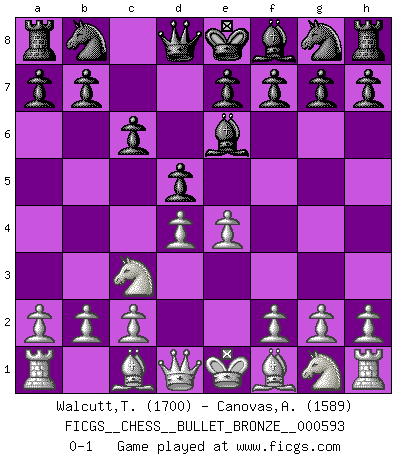 Last move : 0-1 2011 October 10 0:28:32 [Event "FICGS__CHESS__BULLET_BRONZE__000593"] [Site "FICGS"] [Date "2011.10.10"] [Round "1"] [White "Walcutt,Thomas"] [Black "Canovas,Alejandro"] [Result "0-1"] [WhiteElo "1700"] [BlackElo "1589"] 1.e4 c6 2.Nc3 d5 3.d4 Be6 0-1 This chess game has been lost on time (started : 2011.10.10 0:18:25) Caro-Kann defense Player Black won this chess game. Follow this game move after move (download)Bobby is the most misunderstood, misquoted celebrity walking the face of this earth. (Yasser Seirawan) Fischer: 'Remis!?' Uhlmann: 'Aber es muss doch dreimal Zugwiederholung sein!' Fischer: 'Sie nehmen das Remis an, wie ich es sage, sonst spiele ich weiter und werde Sie dann schlagen!' (Robert James Fischer) Uno por uno, yo los acribillé, mi superioridad muy pronto se volvio aparente. (Jose Capablanca) Avant la finale, les dieux ont créé le milieu de partie. (Tarrasch) There will be no order, only chaos. (Sol Robeson in Pi by Darren Aronofsky)
