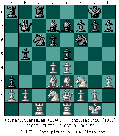 Last move : 1/2-1/2 2012 January 20 1:3:59 [Event "FICGS__CHESS__CLASS_B__000158"] [Site "FICGS"] [Date "2011.10.10"] [Round "1"] [White "Gounant,Stanislas"] [Black "Panov,Dmitriy"] [Result "1/2-1/2"] [WhiteElo "1840"] [BlackElo "1833"] 1.e4 e5 2.Nf3 Nc6 3.Bb5 a6 4.Ba4 Nf6 5.O-O Be7 6.Re1 b5 7.Bb3 d6 8.c3 O-O 9.h3 Na5 10.Bc2 c5 11.d4 Qc7 12.Nbd2 cxd4 13.cxd4 Nc6 14.Nb3 a5 15.Be3 a4 16.Nbd2 Bd7 17.Rc1 Qb7 18.Qe2 Rfc8 19.Bd3 a3 1/2-1/2 Ruy Lopez : Closed Kingside Castling by player White (move 5) Kingside Castling by player Black (move 8) This chess game ended in a draw. Follow this game move after move (download)When I have White, I win because I am white; When I have Black, I win because I am Bogolyubov. (Bogolyubov) Schach wird sich dank seiner hohen kulturellen Tradition immer durchsetzen. In näherer Zukunft womöglich sogar als Gegenreaktion auf die maßlose Reizüberflutung im Freizeit- und Spielbereich. (Garry Kasparov) Tu puedes aprender mucho mas de una partida que pierdas que de una partida ganada. Tendras que perder cientos de partidas antes de llegar a ser un buen jugador. (Jose Raul Capablanca) 'L'échange des dames est un coup dur pour les deux adversaires...' Un journaliste lors d'une partie du match Spassky-Fischer Just because you do not take an interest in politics doesn't mean politics won't take an interest in you. (Pericles 430 B.C.)