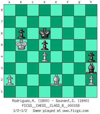 Last move : 1/2-1/2 2012 August 9 16:23:45 [Event "FICGS__CHESS__CLASS_B__000158"] [Site "FICGS"] [Date "2011.10.10"] [Round "1"] [White "Rodriguez,Henderb"] [Black "Gounant,Stanislas"] [Result "1/2-1/2"] [WhiteElo "1800"] [BlackElo "1840"] 1.Nf3 Nf6 2.c4 e6 3.Nc3 c5 4.d4 cxd4 5.Nxd4 Nc6 6.g3 Qb6 7.e3 d5 8.cxd5 Nxd5 9.Nxd5 exd5 10.Bg2 Bb4+ 11.Bd2 Nxd4 12.exd4 Qe6+ 13.Qe2 Bxd2+ 14.Kxd2 Qxe2+ 15.Kxe2 Bg4+ 16.f3 Be6 17.Rac1 Kd7 18.Rc3 Rac8 19.Rhc1 Rxc3 20.Rxc3 a5 21.f4 Kd6 22.Rc5 Rc8 23.Rxc8 Bxc8 24.Kd2 f6 25.Kc3 g5 26.fxg5 fxg5 27.b4 b6 28.Bf1 axb4+ 29.Kxb4 Bd7 30.Bb5 Bh3 31.Bd3 h5 32.Be2 h4 33.gxh4 gxh4 34.Kb5 1/2-1/2 Reti Opening 10 pieces endgame at move 33 : White KBPPP , Black KBPPP WHITE : King + 1 Bishop 3 Pawns BLACK : King + 1 Bishop 3 Pawns This chess game ended in a draw. Follow this game move after move (download)It is difficult to play against Einstein's theory --on his first loss to Fischer. (Mikhail Tal) Die FIDE ist dabei in die Hände der russischen Mafia zu fallen. (Larry Evans) Por esta medida (el intervalo entre Fischer y sus contemporaneos), yo le considero el mas grande campeón mundial. (Garry Kasparov) Les sacrifices démontrent seulement que quelqu'un a gaffé. (Savielly Tartacover) The Movers & Shakers of this world are those who play chess in the mornings and go to the disco in the evenings. (Dinesh De Silva)