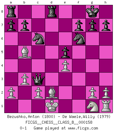 Last move : 0-1 2011 October 15 22:11:44 [Event "FICGS__CHESS__CLASS_B__000158"] [Site "FICGS"] [Date "2011.10.10"] [Round "1"] [White "Bezushko,Anton"] [Black "De Waele,Willy"] [Result "0-1"] [WhiteElo "1800"] [BlackElo "1979"] 1.e4 c5 2.d4 cxd4 3.Qxd4 Nc6 4.Qd1 Nf6 5.Nc3 e6 6.b3 d5 7.f3 Bb4 8.Bd2 dxe4 9.fxe4 Qa5 10.Qf3 e5 11.Bb5 O-O 12.O-O-O Bg4 13.Qd3 Rfd8 14.Qe3 Bxd1 15.Kxd1 Bxc3 16.Qxc3 Qxc3 0-1 Sicilian : Smith-Morra gambit Kingside Castling by player Black (move 11) Queenside Castling by player White (move 12) Player Black won this chess game. Follow this game move after move (download)Of Chess it has been said that life is not long enough for it, but that is the fault of life, not Chess. (William Ewart Napier) Offener Brief an US-Präsident Bush anlässlich der Verhaftung Bobby Fishers: Verhaften Sie mich. Stecken Sie mich in dieselbe Zelle wie Bobby Fisher und geben Sie uns ein Schachspiel mit. (Boris Vassilievich Spassky) Morphy probablemente fue el genio más grande de todos. (Bobby Fischer) Votre prénom est 'Tactique', votre deuxième prénom est 'Tactique' et votre nom est 'Tactique'. (Ken Smith) I'm extremely disappointed. I send you out for exciting, new designer drugs, you come back with tomato sauce. (Gregory House, House M.D.)