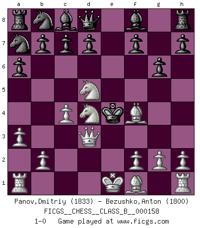 Last move : 1-0 2011 November 23 8:32:51 [Event "FICGS__CHESS__CLASS_B__000158"] [Site "FICGS"] [Date "2011.10.10"] [Round "1"] [White "Panov,Dmitriy"] [Black "Bezushko,Anton"] [Result "1-0"] [WhiteElo "1833"] [BlackElo "1800"] 1.e4 Nf6 2.e5 Nd5 3.d4 e6 4.c4 Nb4 5.Nf3 g6 6.Nc3 a6 7.a3 N4c6 8.d5 Na7 9.Ne4 exd5 10.Nf6+ Ke7 11.Nxd5+ Ke6 12.Nd4+ Kxe5 13.Bf4+ Ke4 14.Qd3+ 1-0 Alekhine's defense Player White won this chess game. Follow this game move after move (download)Look at Garry Kasparov. After he loses, invariably he wins the next game. He just kills the next guy. That's something that we have to learn to be able to do. (Maurice Ashley) Die Neutralität betrachte ich als eine schwere Krankheit. (Viktor Kortschnoi) Diferente gente reacciona diferentemente en aceptar la derrota. (Bobby Fischer) Mais l'homme est une créature légère et illogique : semblable au joueur d'échecs, il n'aime que le processus du but à atteindre, non le but lui-même. (Dostoïevsky) There is a very easy way to return from a casino with a small fortune : go there with a large one. (Jack Yelton)