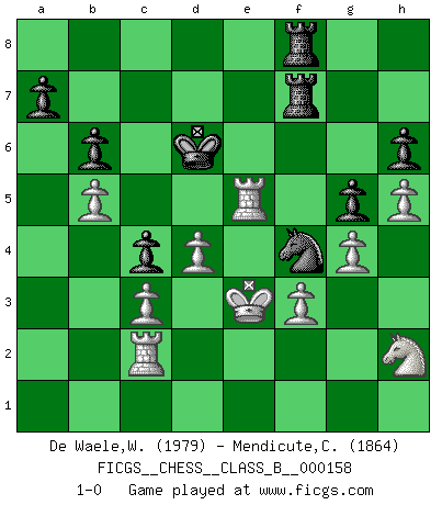 Last move : 1-0 2012 August 25 2:50:1 [Event "FICGS__CHESS__CLASS_B__000158"] [Site "FICGS"] [Date "2011.10.10"] [Round "1"] [White "De Waele,Willy"] [Black "Mendicute,Claudio"] [Result "1-0"] [WhiteElo "1979"] [BlackElo "1864"] 1.e4 e6 2.d4 d5 3.Nc3 Bb4 4.e5 c5 5.a3 Bxc3+ 6.bxc3 Qa5 7.Bd2 Qa4 8.Qb1 c4 9.h4 Nc6 10.h5 h6 11.g3 Bd7 12.Bh3 Nge7 13.Nf3 O-O-O 14.O-O Rdf8 15.Re1 g5 16.Nh2 Ng8 17.Qd1 f5 18.exf6 Nxf6 19.Bxe6 Bxe6 20.Rxe6 Kb8 21.Be1 Rh7 22.g4 Rhf7 23.f3 Ka8 24.Bg3 Nd8 25.Re3 Ne8 26.Qb1 Nc6 27.Qb2 Ng7 28.Rae1 b6 29.R3e2 Rf6 30.Be5 Nxe5 31.Rxe5 Qc6 32.a4 Qxa4 33.Rxd5 Ne6 34.Qb4 Qxb4 35.cxb4 Kb7 36.c3 Kc6 37.Rde5 Nc7 38.Kf1 Nd5 39.b5+ Kd6 40.Kg2 Nf4+ 41.Kg3 Nd5 42.Rc1 Rf4 43.Rc2 R4f6 44.Re1 R6f7 45.R2c1 Rf4 46.Rc2 R4f7 47.R1e2 Rf4 48.Kg2 R4f6 49.Kf2 R6f7 50.Re5 Nf4 51.Ke3 1-0 French : Winawer, Advance variation Queenside Castling by player Black (move 13) Kingside Castling by player White (move 14) Player White won this chess game. Follow this game move after move (download)You cannot play at Chess if you are kind-hearted. (French Proverb) Die Leute spielen gegen mich seit 15 Jahren unter Ihren Möglichkeiten. (Robert James Fischer) Si el ingenio solamente fuese necesario para lucirse, las mujeres serían las mejores jugadoras de Ajedrez del mundo. (Albin) Vous m'avez demandé de vous exposer quel est le fondement de la prière. Je ne fais que préparer les pièces du jeu sur la table... Nous sera-t-il permis d'en adopter les règles et si nous les appliquons scrupuleusement nous ne tarderons pas à faire mat le Roi divin ! Il ne pourra échapper à nos mains. (Sainte Thérèse d'Avila, Chemin de perfection) Begin at the beginning and go on till you come to the end; then stop. (Lewis Carrol, Alice in Wonderland)