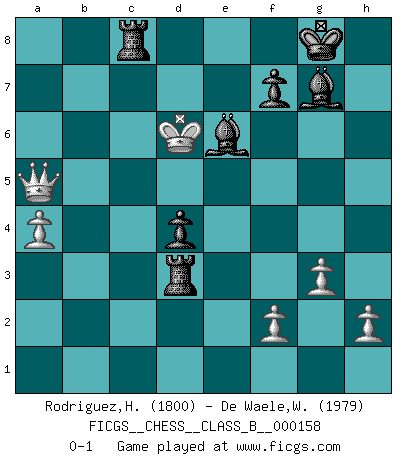 Last move : 0-1 2012 February 4 1:53:39 [Event "FICGS__CHESS__CLASS_B__000158"] [Site "FICGS"] [Date "2011.10.10"] [Round "1"] [White "Rodriguez,Henderb"] [Black "De Waele,Willy"] [Result "0-1"] [WhiteElo "1800"] [BlackElo "1979"] 1.Nf3 Nf6 2.c4 g6 3.g3 Bg7 4.Bg2 O-O 5.O-O d6 6.d4 Nc6 7.d5 Na5 8.Nbd2 c5 9.e4 a6 10.Rb1 b5 11.b3 Rb8 12.Qc2 e6 13.dxe6 Bxe6 14.Ng5 Bd7 15.Bb2 Nc6 16.Ndf3 h6 17.Nh3 g5 18.Nhxg5 hxg5 19.Nxg5 bxc4 20.Qxc4 Qa5 21.a3 Nd4 22.Bxd4 cxd4 23.a4 Qxg5 24.Qxa6 Qc5 25.Rfc1 Rxb3 26.Rxc5 Rxb1+ 27.Bf1 dxc5 28.Kg2 Nxe4 29.Bd3 Bc8 30.Qa5 Bh3+ 31.Kf3 Rb3 32.Kxe4 Re8+ 33.Kd5 c4 34.Kxc4 Be6+ 35.Kc5 Rc8+ 36.Kd6 Rxd3 0-1 Reti Opening Kingside Castling by player Black (move 4) Kingside Castling by player White (move 5) Player Black won this chess game. Follow this game move after move (download)The stomach is an essential part of the Chess master. (Bent Larsen) Kein Großmeister ist normal. Sie unterscheiden sich nur im Ausmaß Ihrer Verrücktheit. (Viktor Kortschnoi) No volvere nunca a jugar contigo. Has insultado a mi amigo. - cuando un oponente se maldijo por una mala jugada (Miguel Najdorf) Les écrivains ont utilisé les échecs pour analyser les côtés extrêmes de la nature humaine. Dans ce cadre, les échecs offrent un champ d'expérimentation idéal. Mais on pourrait faire la même chose avec la peinture. Et là, en vous référant à Van Gogh, vous ne tirerez pas de conclusion définitive sur les peintres. (Gary Kasparov) Chess, like love, like music, has the power to make people happy. (Siegbert Tarrasch)