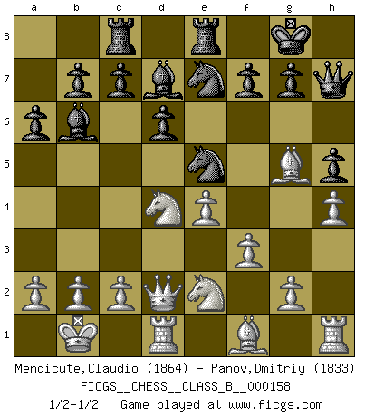 Last move : 1/2-1/2 2012 January 23 21:42:31 [Event "FICGS__CHESS__CLASS_B__000158"] [Site "FICGS"] [Date "2011.10.10"] [Round "1"] [White "Mendicute,Claudio"] [Black "Panov,Dmitriy"] [Result "1/2-1/2"] [WhiteElo "1864"] [BlackElo "1833"] 1.e4 e5 2.Nf3 Nc6 3.d4 exd4 4.Nxd4 Bc5 5.Nb3 Bb6 6.Nc3 Qf6 7.Qe2 Nge7 8.Be3 O-O 9.O-O-O d6 10.h4 Be6 11.f3 Rfe8 12.Kb1 h5 13.Nb5 Rac8 14.Bg5 Qg6 15.Qd2 a6 16.N5d4 Bd7 17.Ne2 Qh7 18.Nbd4 Ne5 1/2-1/2 Scotch : Potter variation Kingside Castling by player Black (move 8) Queenside Castling by player White (move 9) This chess game ended in a draw. Follow this game move after move (download)Chess is the art of analysis. (Mikhail Botvinnik) Ihnen, Herr Lasker, habe ich nur drei Worte zu sagen: Schach und matt. (Siegbert Tarrasch) Hay jugadores fuertes y personas amables y yo soy un jugador fuerte. (Bobby Fischer) Karpov est une pièce de musée. (Garry Kasparov) The human is the only animal species whose members are able to talk themselves into difficulties that would not otherwise exist. (Wendell Johnson)