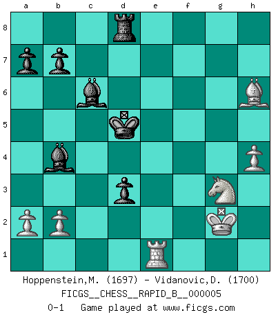 Last move : 0-1 2006 September 4 14:58:25 [Event "FICGS__CHESS__RAPID_B__000005"] [Site "FICGS"] [Date "2006.05.10"] [Round "1"] [White "Hoppenstein,Michael"] [Black "Vidanovic,Djordje"] [Result "0-1"] [WhiteElo "1697"] [BlackElo "1700"] 1.d4 Nf6 2.Nf3 d5 3.e3 c5 4.Nbd2 e6 5.c3 Nc6 6.Bd3 Be7 7.O-O O-O 8.Ne5 Nxe5 9.dxe5 Nd7 10.f4 f5 11.exf6 Nxf6 12.e4 g6 13.Bc2 Qc7 14.e5 Nh5 15.Qg4 Bd7 16.Bxg6 hxg6 17.Qxg6+ Ng7 18.Rf3 Be8 19.Qh6 Nf5 20.Qxe6+ Kg7 21.Nf1 Qd7 22.Qxd7 Bxd7 23.g4 Nh4 24.Rh3 d4 25.f5 Nxf5 26.gxf5 Rxf5 27.Rg3+ Kf7 28.Bh6 Rh8 29.Bg7 Rd8 30.Bh6 Rxe5 31.Rg7+ Ke6 32.cxd4 cxd4 33.Rg2 Bc5 34.Rg6+ Kd5 35.Ng3 d3 36.Kg2 Bc6 37.Kf1 Be8 38.Rg5 Bb5 39.Rxe5+ Kxe5 40.Re1+ Kd5 41.Kg2 Bc6 42.h4 Bb4 0-1 Queen's pawn game Kingside Castling by player White (move 7) Kingside Castling by player Black (move 7) Player Black won this chess game. Follow this game move after move (download)Chess is life. (Bobby Fischer) Woher wissen wir, daß der Neanderthaler Blindschach gespielt hat? -- Bei Ausgrabungen wurden keine Schachbretter und Figuren gefunden. (Anonymous) Durante una competencia de Ajedrez, un Maestro de Ajedrez deberá ser una combinación de presa de caza y un Monge. (Alexander Alekhine) Si je n'étais pas joueur d'échecs, je serais le meilleur dans quelque chose d'autre. (Anatoli Karpov) God, you are such an idiot. - Actually, I thought I was more of a jerk. (Gregory House to Stacy Warner, House M.D.)