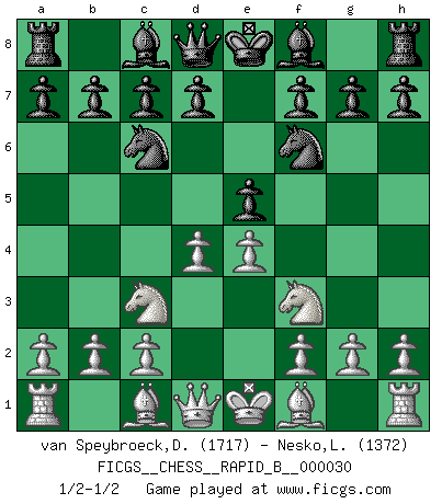 Last move : 1/2-1/2 2007 January 10 17:42:13 [Event "FICGS__CHESS__RAPID_B__000030"] [Site "FICGS"] [Date "2007.01.03"] [Round "1"] [White "van Speybroeck,Dirk-Jan"] [Black "Nesko,Lawrence"] [Result "1/2-1/2"] [WhiteElo "1717"] [BlackElo "1372"] 1.Nc3 Nf6 2.e4 e5 3.Nf3 Nc6 4.d4 1/2-1/2 Dunst (Sleipner, Heinrichsen) Opening This chess game ended in a draw. Follow this game move after move (download)In order to improve your game, you must study the endgame before everything else, for whereas the endings can be studied and mastered by themselves, the middle game and the opening must be studied in relation to the endgame. (Jose Raul Capablanca) Wenn es im Universum noch irgendwo intelligente Lebewesen gibt, dann kennen sie Go. (Emanuel Lasker) Un entendimiento minucioso de las típicas continuaciones de mate hacen de las mas complicadas combinaciones de sacrificio que conducen hacia ellas no solo no dificiles, sino casi un asunto de rutina. (Siegbert Tarrasch) Je ne crois pas en la psychologie, je crois aux bons coups. (Robert Fischer) A belief is an idea the mind possesses, an idea that possesses the mind. (Robert Oxden Bolton)