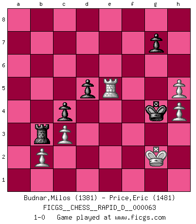 Last move : 1-0 2012 January 30 18:37:5 [Event "FICGS__CHESS__RAPID_D__000063"] [Site "FICGS"] [Date "2011.10.10"] [Round "1"] [White "Budnar,Milos"] [Black "Price,Eric"] [Result "1-0"] [WhiteElo "1381"] [BlackElo "1481"] 1.e4 e5 2.Nf3 Nc6 3.Bb5 a6 4.Ba4 Nf6 5.O-O Nxe4 6.d4 b5 7.Bb3 d5 8.dxe5 Be6 9.h3 Bc5 10.Be3 O-O 11.Bxc5 Nxc5 12.Nbd2 Ne7 13.Nd4 Nxb3 14.Nd2xb3 c6 15.Nc5 Qc8 16.Ndxe6 fxe6 17.Qg4 Nf5 18.c3 Ra7 19.a4 Qe8 20.axb5 cxb5 21.Rxa6 Rxa6 22.Nxa6 Qc6 23.Nb4 Qc4 24.Qxc4 bxc4 25.g3 Ne7 26.f4 Rc8 27.g4 Nc6 28.Nxc6 Rxc6 29.Rb1 Rb6 30.Kg2 Rb3 31.f5 Kf7 32.h4 h5 33.fxe6+ Kxe6 34.gxh5 Kxe5 35.Re1+ Kf4 36.Re2 Kg4 37.Re5 1-0 This chess game has been lost on time (started : 2011.10.10 8:9:13) Ruy Lopez : Open, 7.Bb3 Kingside Castling by player White (move 5) Kingside Castling by player Black (move 10) Player White won this chess game. Follow this game move after move (download)The laws of Chess do not permit a free choice: you have to move whether you like it or not. (Emanuel Lasker) Schach ist ein schwarz-weisser Dschungel. (Garry Kasparov) Peones: ellos son el alma de esta partida, solos forman el ataque y la defensa. (Philidor) Ce n'est pas pour s'amuser qu'il joue aux échecs : il célèbre un culte. (Vladimir Nabokov) You cannot beat a roulette table unless you steal money from it. (Albert Einstein)