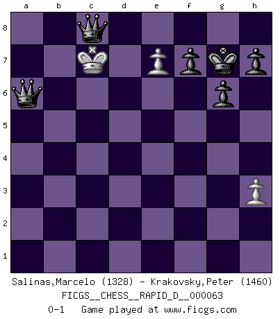 Last move : 0-1 2012 January 25 22:28:38 [Event "FICGS__CHESS__RAPID_D__000063"] [Site "FICGS"] [Date "2011.10.10"] [Round "1"] [White "Salinas,Marcelo"] [Black "Krakovsky,Peter"] [Result "0-1"] [WhiteElo "1328"] [BlackElo "1460"] 1.e4 c5 2.e5 Nc6 3.Nf3 g6 4.Na3 Bg7 5.d4 cxd4 6.Nxd4 Nxe5 7.Nc4 Nxc4 8.Bxc4 d5 9.Bb5 Bd7 10.Bxd7 Qxd7 11.O-O Nf6 12.h3 O-O 13.c3 Ne4 14.Qd3 e5 15.Qb5 Rfd8 16.Qxd7 Rxd7 17.Be3 exd4 18.cxd4 Rc8 19.Rac1 Rdc7 20.Bf4 Rxc1 21.Bxc1 Bxd4 22.Be3 Bxe3 23.fxe3 Rc2 24.Rb1 Nd2 25.Rd1 Rxb2 26.Kf2 Rxa2 27.Ke1 Nc4 28.Rxd5 Rxg2 29.Rd8 Kg7 30.Re8 a5 31.Re4 b5 32.Kf1 Nd2+ 33.Kxg2 Nxe4 34.Kf1 a4 35.Ke2 a3 36.Kd3 a2 37.Kxe4 a1Q 38.Kd5 b4 39.e4 b3 40.e5 b2 41.e6 b1Q 42.e7 Qf5+ 43.Kc6 Qa6+ 44.Kc7 Qf5c8+ 0-1 Sicilian defense Kingside Castling by player White (move 11) Kingside Castling by player Black (move 12) 10 pieces endgame at move 33 : White KPP , Black KNPPPPP WHITE : King + 2 Pawns BLACK : King + 1 Knight 5 Pawns 9 pieces endgame at move 37 : White KPP , Black KPPPPP WHITE : King + 2 Pawns BLACK : King + 5 Pawns Promotion Queen by player Black (move 37) Promotion Queen by player Black (move 41) Player Black won this chess game. Follow this game move after move (download)My opponents make good moves too. Sometimes I don't take these things into consideration. (Bobby Fischer) Das Schachspiel übertrifft alle anderen Spiele so weit wie der Chimborasso einen Misthaufen. (Arthur Schopenhauer) Un sacrificio se refuta mucho mejor al aceptarlo. (Wilhelm Steinitz) J'apprécie les joueurs d'est-indienne, c'est grâce à eux que je nourris ma famille depuis tant d'années. (Petrosian) Life doesn't imitate art, it imitates bad television. (Woody Allen)