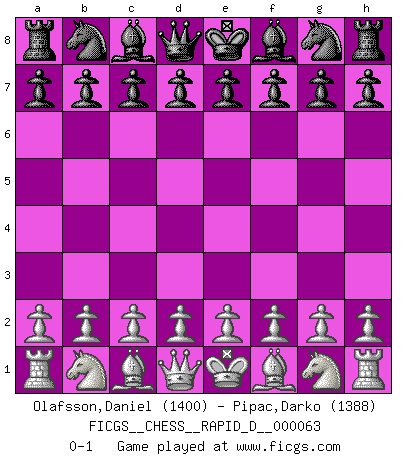 Last move : 0-1 2011 November 9 12:35:55 [Event "FICGS__CHESS__RAPID_D__000063"] [Site "FICGS"] [Date "2011.10.10"] [Round "1"] [White "Olafsson,Daniel"] [Black "Pipac,Darko"] [Result "0-1"] [WhiteElo "1400"] [BlackElo "1388"] 0-1 This chess game has been lost on time (started : 2011.10.10 8:9:13) Player Black won this chess game. Follow this game move after move (download)Of all my Russian books, the defense contains and diffuses the greatest 'warmth' which may seem odd seeing how supremely abstract Chess is supposed to be. (Vladimir Nabokov) Die westlichen Werte sind eine Sprache, welche die Putin-Administration nicht versteht. (Garry Kasparov) El Ajedrez es tortura mental. (Garry Kasparov) On peut tirer plus d'utilité d'une partie perdue que de 100 parties gagnées. (Capablanca) I don't diet. I just don't eat as much as I'd like to. (Linda Evangelista, supermodel)