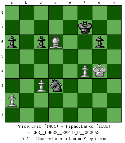 Last move : 0-1 2011 December 29 5:31:44 [Event "FICGS__CHESS__RAPID_D__000063"] [Site "FICGS"] [Date "2011.10.10"] [Round "1"] [White "Price,Eric"] [Black "Pipac,Darko"] [Result "0-1"] [WhiteElo "1481"] [BlackElo "1388"] 1.e4 e5 2.Nf3 Nc6 3.Bb5 d6 4.d4 exd4 5.Nxd4 Bd7 6.O-O a6 7.Nxc6 Bxc6 8.Bxc6+ bxc6 9.Nc3 d5 10.Re1 Bb4 11.exd5 Ne7 12.dxc6 Qxd1 13.Rxd1 Bxc3 14.bxc3 Nxc6 15.Ba3 Rd8 16.Rd3 f6 17.Rxd8+ Kxd8 18.Rd1+ Kc8 19.h4 Rd8 20.Rxd8+ Kxd8 21.h5 f5 22.Bf8 g6 23.hxg6 hxg6 24.Bh6 Ne5 25.Bf4 Nc4 26.Kh2 Na3 27.Kh3 c6 28.Kh4 Ke7 29.Kg5 Kf7 30.Bd6 Nxc2 31.g4 fxg4 32.Kxg4 Ne1 33.f4 Nd3 0-1 This chess game has been lost on time (started : 2011.10.10 8:9:13) Ruy Lopez : Old Steinitz defense Kingside Castling by player White (move 6) 10 pieces endgame at move 32 : White KBPPP , Black KNPPP WHITE : King + 1 Bishop 3 Pawns BLACK : King + 1 Knight 3 Pawns Player Black won this chess game. Follow this game move after move (download)A good player is always lucky. (Jose Raul Capablanca) Du weisst es gibt ein Problem mit Computern und Fernschach, wenn jeder eine Rating von 2450 hat. (John Christen Knudsen) La pasion por jugar al Ajedrez es una de las mas inexplicables en el mundo. (H.G. Wells) Assurément je connaissais par expérience le mystérieux attrait de ce jeu royal, le seul entre tous les jeux inventés par les hommes qui échappe souverainement à la tyrannie du hasard, le seul où l'on ne doive sa victoire qu'à son intelligence ou plutôt à une certaine forme d'intelligence. Mais n'est-ce pas déjà le limiter injurieusement que d'appeler les échecs un jeu ? N'est-ce pas une science, un art ou quelque chose qui, comme le cercueil de Mahomet entre ciel et terre, est suspendu entre l'un et l'autre, et qui réunit un nombre incroyable de contraires ? [...] C'est une pensée qui ne mène à rien, une mathématique qui n'établit rien, un art qui ne laisse pas d'uvre, une architecture sans matière; et il l'a prouvé néanmoins qu'il était plus durable, à sa manière, que les livres ou que tout autre monument, ce jeu unique qui appartient à tous les peuples et à tous les temps, et dont personne ne sait quel dieu en fit don à la terre pour tuer l'ennui, pour aiguiser l'esprit et stimuler l'âme. Où commence-t-il, où finit-il ? (Stefan Zweig) Perseverance does not equal worthiness. Next time you want to get my attention, wear something fun. Low-riding jeans are hot. (Gregory House, House M.D.)