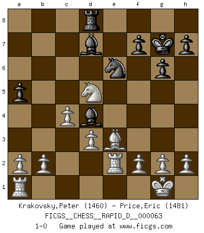 Last move : 1-0 2011 November 15 4:16:44 [Event "FICGS__CHESS__RAPID_D__000063"] [Site "FICGS"] [Date "2011.10.10"] [Round "1"] [White "Krakovsky,Peter"] [Black "Price,Eric"] [Result "1-0"] [WhiteElo "1460"] [BlackElo "1481"] 1.e4 e5 2.Nf3 Nc6 3.Bb5 a6 4.Ba4 Nf6 5.O-O Nxe4 6.Re1 Nc5 7.Bxc6 dxc6 8.Nxe5 Ne6 9.Qh5 g6 10.Qf3 Qe7 11.Nxc6 bxc6 12.Qxc6+ Qd7 13.Qxa8 Bg7 14.Nc3 O-O 15.Nd5 Rd8 16.c4 Bd4 17.d3 c6 18.Qxc6 Kg7 19.Qxd7 Bxd7 20.Re2 a5 21.Be3 1-0 Ruy Lopez : Open (Tarrasch) defense Kingside Castling by player White (move 5) Kingside Castling by player Black (move 14) Player White won this chess game. Follow this game move after move (download)Chess problems demand from the composer the same virtues that characterize all worthwhile art: originality, invention, conciseness, harmony, complexity, and splendid insincerity. (Vladimir Nabokov) Im Internet Chess Club betrug mein Rating vorübergehend 3350 ELO-Punkte. (Sergej Karjakin) Alguna parte de un error es siempre correcto. (Savielly Tartakover) Lorsque vous vous retrouvez devant une position atroce, ne tendez pas un ultime piège dérisoire avec l'intention d'abandonner si l'adversaire le déjoue ! Faites-vous plutôt un devoir de résister comme si votre vie en dépendait. Jouez le coup qui vous déplairait au centuple si vous étiez dans la peau de votre tortionnaire ! Now be brave and don't look back. Don't look back. (Shmi Skywalker in Star Wars ep.1)