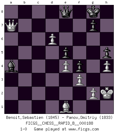 Last move : 1-0 2012 January 26 19:33:29 [Event "FICGS__CHESS__RAPID_B__000188"] [Site "FICGS"] [Date "2011.10.10"] [Round "1"] [White "Benoit,Sebastien"] [Black "Panov,Dmitriy"] [Result "1-0"] [WhiteElo "1845"] [BlackElo "1833"] 1.d4 Nf6 2.c4 e6 3.Nf3 Bb4+ 4.Nbd2 b6 5.a3 Bxd2+ 6.Bxd2 Bb7 7.e3 O-O 8.Bd3 Ne4 9.O-O f5 10.Qe2 d6 11.Be1 Nd7 12.Nd2 e5 13.f3 Nxd2 14.Bxd2 Qe7 15.d5 a5 16.e4 f4 17.b4 Bc8 18.Rfb1 axb4 19.axb4 Bb7 20.Be1 Rfb8 21.Bf2 Ba6 22.Ra2 Qf8 23.Rba1 Bb7 24.Qb2 Rxa2 25.Rxa2 Ra8 26.c5 dxc5 27.Bb5 Rxa2 28.Qxa2 Qd6 29.Qa7 Bc8 30.Qa8 Qf8 31.bxc5 bxc5 32.Bh4 c4 33.Qc6 Qd6 34.Qxc4 Kf8 35.Bf2 Kf7 36.h4 h5 37.Kh2 Kg6 38.Qa4 Nf6 39.Qa7 Kf7 40.Qa5 Nd7 41.Qa8 Qf8 42.Be1 Nb6 43.Qb8 Qe7 44.Bf2 Bd7 45.Qxc7 Bxb5 46.Qxb6 Ba4 47.Be1 Kg8 48.d6 Qe8 49.Qa7 1-0 Bogo-Indian defense, Gruenfeld variation Kingside Castling by player Black (move 7) Kingside Castling by player White (move 9) Player White won this chess game. Follow this game move after move (download)The tactician must know what to do whenever something needs doing; the strategist must know what to do when nothing needs doing. (Savielly Tartakover) Oft bringt ein stiller Zug das Erdbeben. (Richard Reti) Entre mas años cumplo, mas valoro los Peones. (Keres) Soyez une menace à chaque fois que vous vous asseyez pour jouer. (Ken Smith) Your best chance to get a Royal Flush in a casino is in the bathroom. (Anonymous)