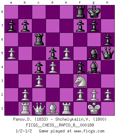 Last move : 1/2-1/2 2012 January 6 16:44:10 [Event "FICGS__CHESS__RAPID_B__000188"] [Site "FICGS"] [Date "2011.10.10"] [Round "1"] [White "Panov,Dmitriy"] [Black "Shchelykalin,Vyacheslav"] [Result "1/2-1/2"] [WhiteElo "1833"] [BlackElo "1800"] 1.e4 c5 2.c3 e6 3.d4 d5 4.e5 Nc6 5.Nf3 Qb6 6.a3 c4 7.Nbd2 Na5 8.Be2 Bd7 9.O-O Nh6 10.Rb1 Nf5 11.Qc2 Rc8 12.Re1 h6 13.Nf1 Be7 14.Bd1 O-O 15.Ne3 Nb3 16.Nxf5 exf5 17.Nd2 Nxc1 18.Qxc1 Bg5 19.Bc2 Qe6 20.Rf1 f4 21.Nf3 Qg4 22.Re1 Qh5 23.a4 Rc6 24.a5 Bg4 25.Bd1 1/2-1/2 Sicilian : Alapin's variation (2.c3) Kingside Castling by player White (move 9) Kingside Castling by player Black (move 14) This chess game ended in a draw. Follow this game move after move (download)As one by one I mowed them down, my superiority soon became apparent. (Jose Capablanca) Wenn ein Kopf und ein Buch zusammenstoßen und es klingt hohl, ist es denn allemal im Buche? (Georg Christoph Lichtenberg) Un jugador que es sorprendido, esta derrotado a medias. (Proverbio) Le succès, c'est être capable d'aller d'échec en échec sans perdre son enthousiasme. (Winston Churchill) Don't be discouraged. It's often the last key in the bunch that opens the lock. (Author unknown)