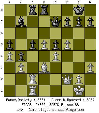 Last move : 1-0 2012 January 13 12:12:9 [Event "FICGS__CHESS__RAPID_B__000188"] [Site "FICGS"] [Date "2011.10.10"] [Round "1"] [White "Panov,Dmitriy"] [Black "Sternik,Ryszard"] [Result "1-0"] [WhiteElo "1833"] [BlackElo "1825"] 1.e4 e5 2.Nf3 Nc6 3.Bb5 a6 4.Ba4 Nf6 5.O-O Be7 6.Re1 b5 7.Bb3 d6 8.c3 O-O 9.h3 Na5 10.Bc2 c5 11.d4 Nd7 12.Nbd2 exd4 13.cxd4 Nc6 14.d5 Nce5 15.a4 b4 16.Nxe5 Nxe5 17.f4 Ng6 18.Nc4 Bb7 19.f5 Ne5 20.Nxe5 dxe5 21.Bd3 Rc8 22.Qe2 a5 23.b3 Bf6 24.Ra2 Bg5 25.Bxg5 Qxg5 26.Rc2 Rfd8 27.Qf2 Qe7 28.Rec1 1-0 Ruy Lopez : Closed Kingside Castling by player White (move 5) Kingside Castling by player Black (move 8) Player White won this chess game. Follow this game move after move (download)You are for me the Queen on d8 and I am the Pawn on d7 !! (Eduard Gufeld) Ein Teil des Fehlers ist immer korrekt. (Savielly Grigorievitsch Tartakower) Si el Ajedrez es una ciencia, es la mas inexacta. Si el Ajedrez es un arte, es demasiado inexacto para ser visto como tal. Si el Ajedrez es un deporte, es demasiado esotérico. Si el Ajedrez es un juego, es demasiado exigente para ser solo un juego. Si el Ajedrez es una aventura, es una muy demandante. Si el Ajedrez es una pasión, es una muy gratificante. Si el Ajedrez es la vida, es una muy triste. (Anónimo) Fischer est le meilleur joueur du monde et Karpov n'est qu'un joueur de bistrot. (Garry Kasparov, agé de 16 ans) In my experience, there's no such thing as luck. (Obi-Wan Kenobi in Star Wars ep.4)