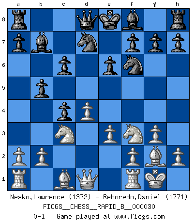 Last move : 0-1 2007 February 16 22:36:47 [Event "FICGS__CHESS__RAPID_B__000030"] [Site "FICGS"] [Date "2007.01.03"] [Round "1"] [White "Nesko,Lawrence"] [Black "Reboredo,Daniel"] [Result "0-1"] [WhiteElo "1372"] [BlackElo "1771"] 1.Nf3 d5 2.c4 c6 3.d4 Nf6 4.Nc3 dxc4 5.e3 b5 6.g3 e6 7.Bg2 Nbd7 8.O-O Bb7 0-1 This chess game has been lost on time (started : 2007.01.03 21:24:42) Reti Opening Kingside Castling by player White (move 8) Player Black won this chess game. Follow this game move after move (download)A player surprised is half beaten. (Proverb) Gott hat gewollt, dass ich Champion werde. (Surab Azmajparaschvili) Aquellos que dicen entender al Ajedrez, no entienden nada. (Robert Hubner) La menace est plus forte que l'exécution. (Aaron Nimzovitch) Establishing goals is all right if you don't let them deprive you of interesting detours. (Doug Larson)